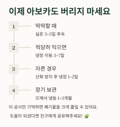 조금만 신경 쓰면 상태 좋은 아보카도를 더 오래 즐길 수 있어요. 참고가 되셨길 바랄게요.