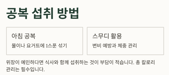아침 공복에 1스푼을 물이나 요거트, 스무디에 섞는 방법이 있습니다.