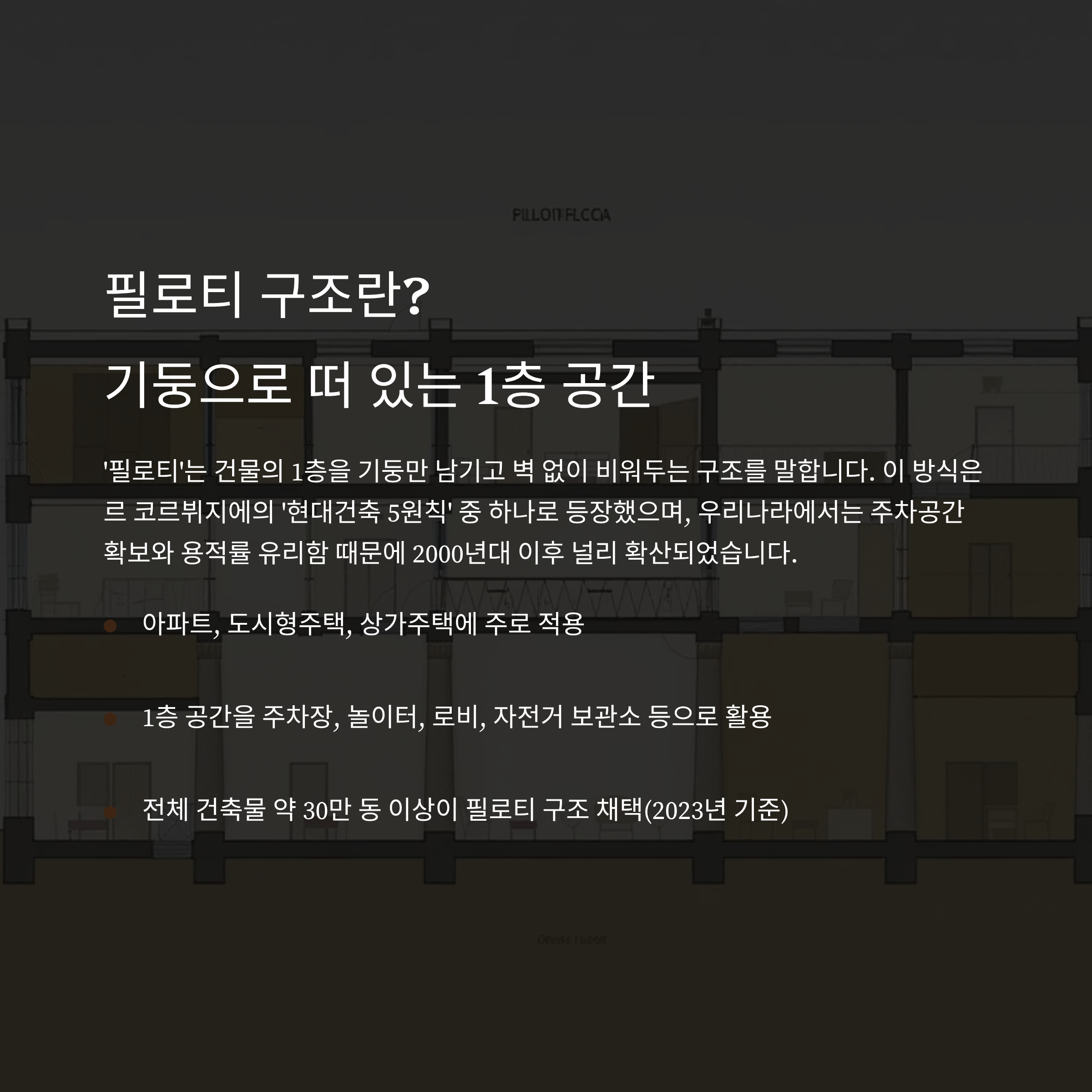 - 전체 건축물 약 30만 동 이상이 필로티 구조 채택(2023년 기준)