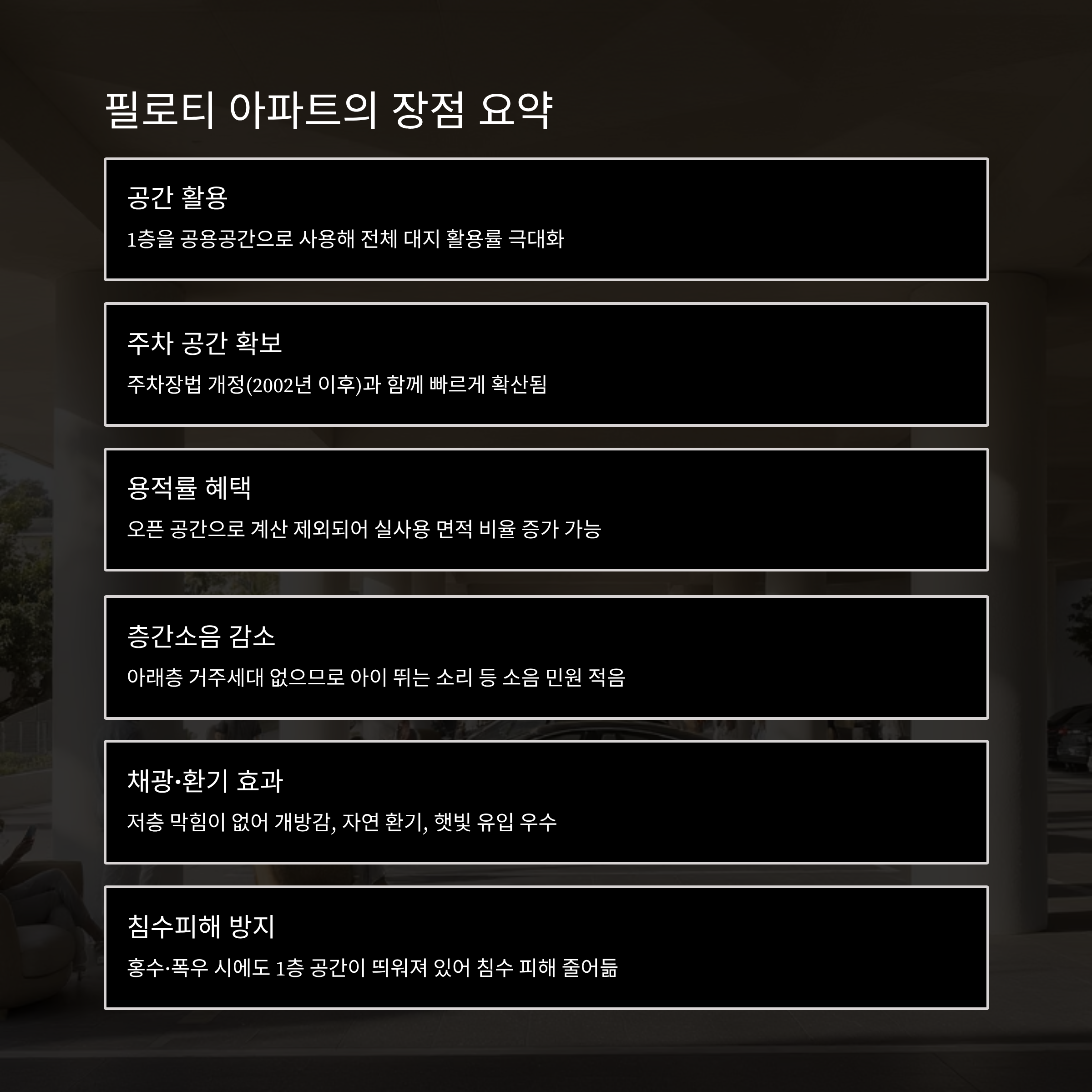 필로티 구조는 현대 도시 아파트와 주택에서 공간을 극대화하고 주차난을 해소하는 대표적인 설계 방식입니다.
