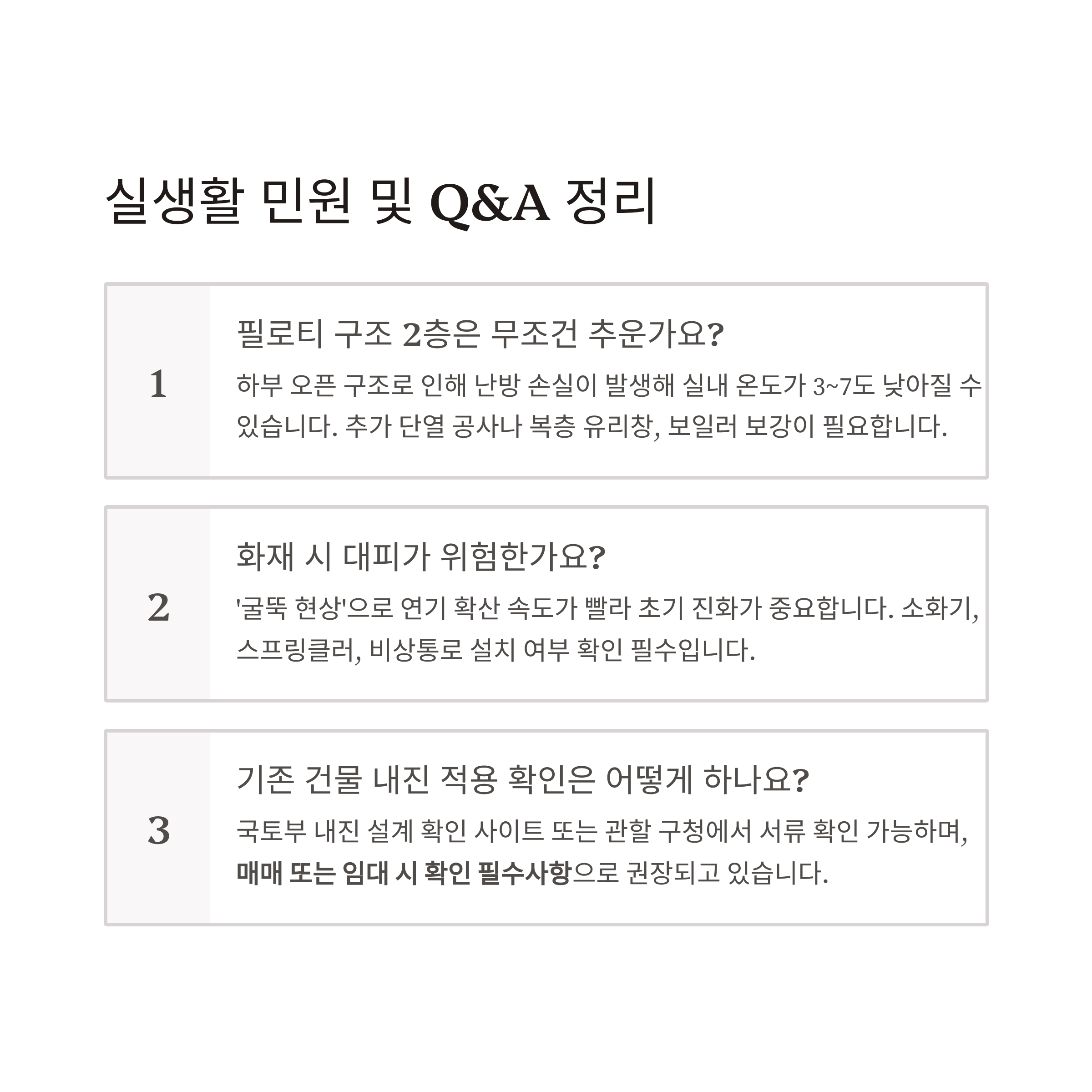 | 겨울철 난방비 상승 | 하부가 비어 있어 열 손실 많고, 2층 이상 실내 온도 하락 사례 다수 |