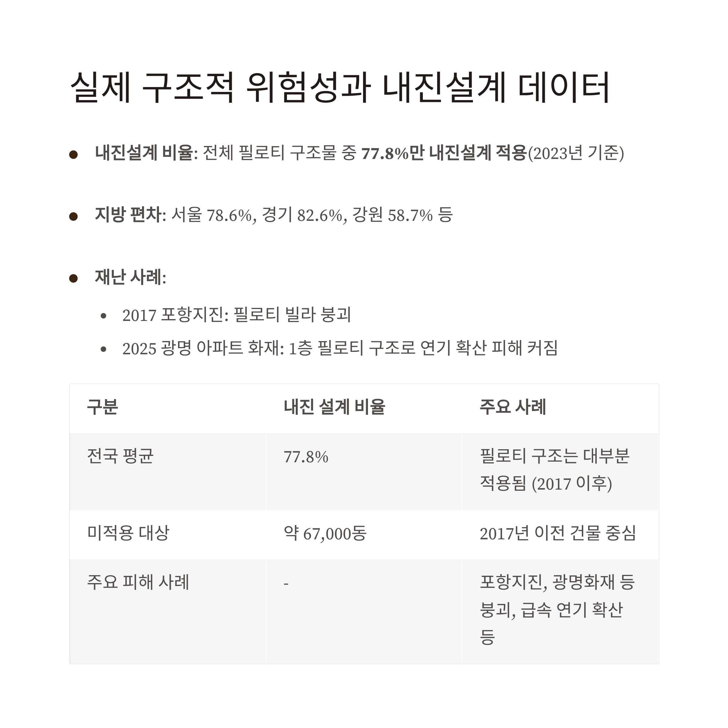 - 내진설계 비율: 전체 필로티 구조물 중 77.8%만 내진설계 적용(2023년 기준)