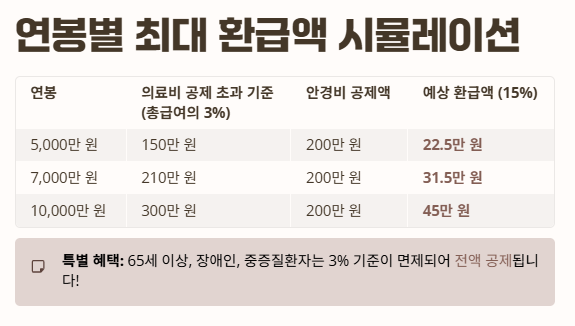| 연봉 | 의료비 공제 초과 기준 (총급여의 3%) | 안경비 공제액 | 예상 환급액 (15%) |