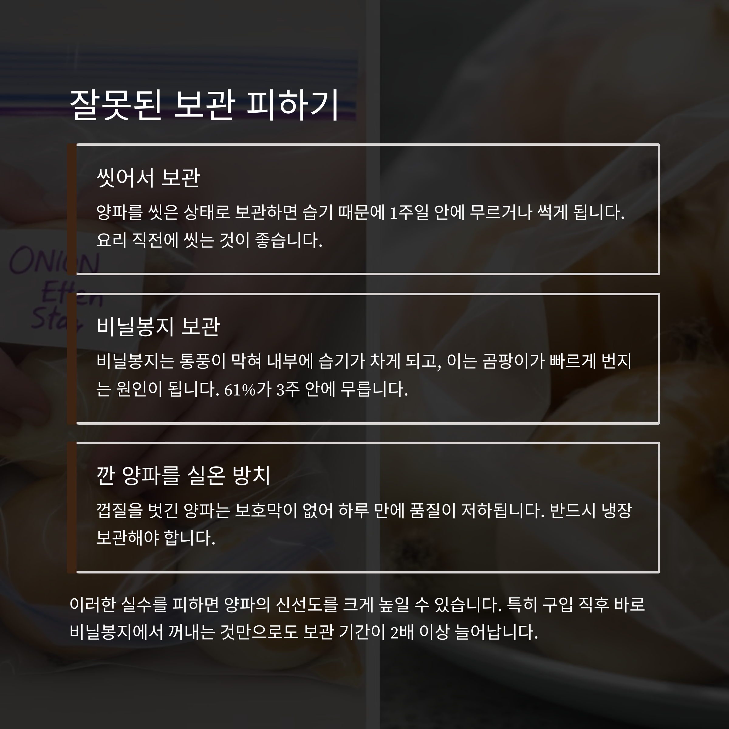 - 깐 양파는 냉장, 랩+밀폐용기 (3~7일)