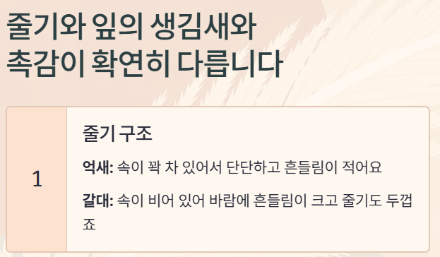 반면 갈대는 속이 비어 있어 바람에 흔들림이 크고 줄기도 두껍죠.