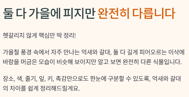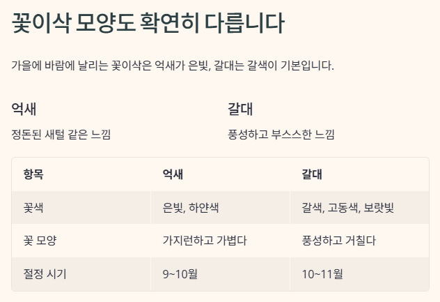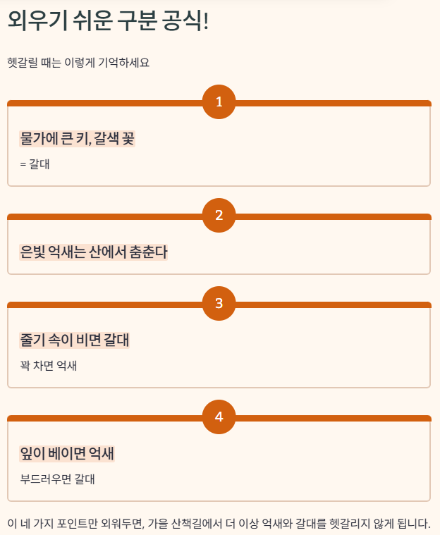 이 네 가지 포인트만 외워두면, 가을 산책길에서 더 이상 억새와 갈대를 헷갈리지 않게 됩니다.