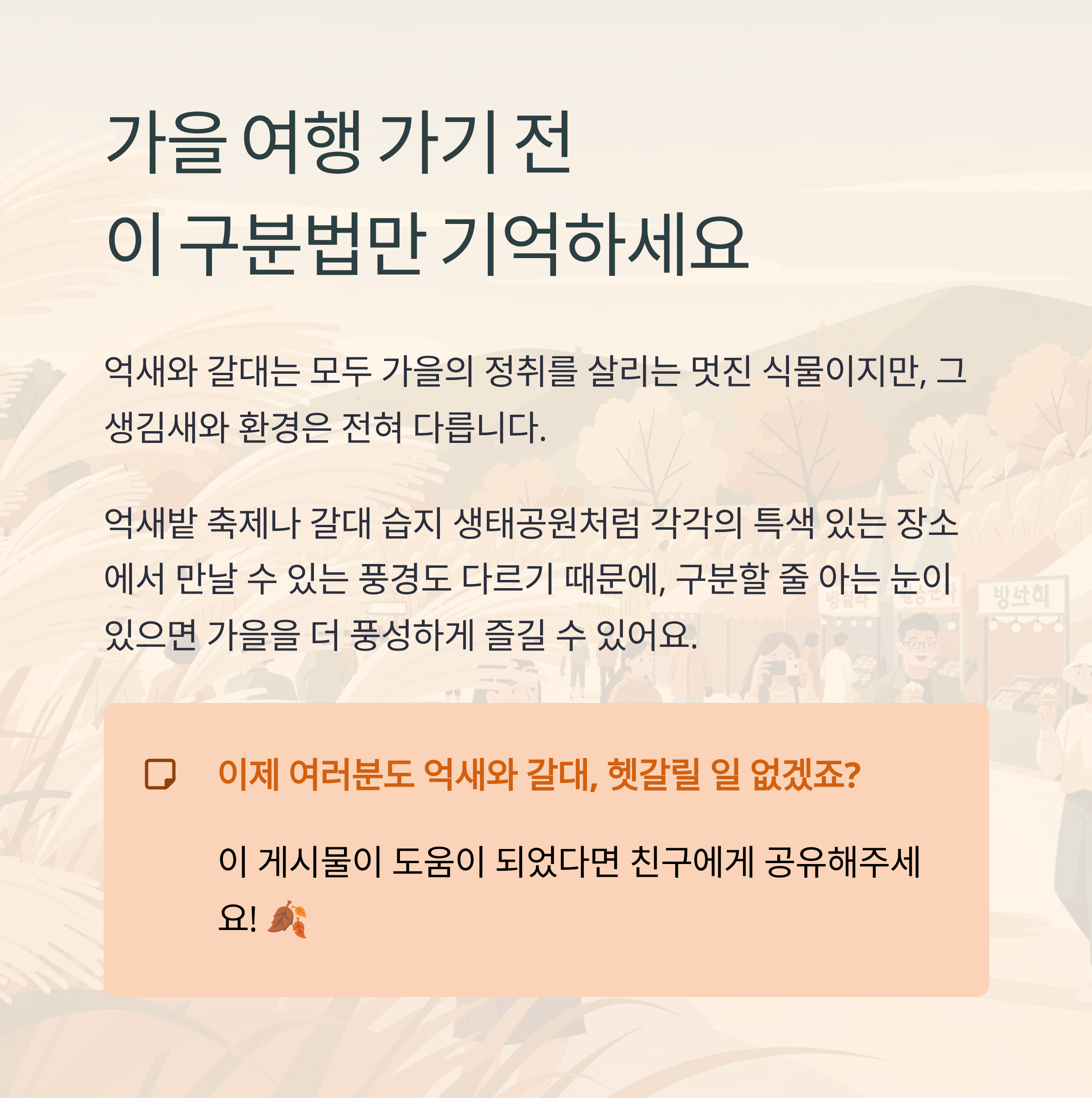 특히 억새밭 축제나 갈대 습지 생태공원처럼 각각의 특색 있는 장소에서 만날 수 있는 풍경도 다르기 때문에, 구분할 줄 아는 눈이 있으면 가을을 더 풍성하게 즐길 수 있어요.