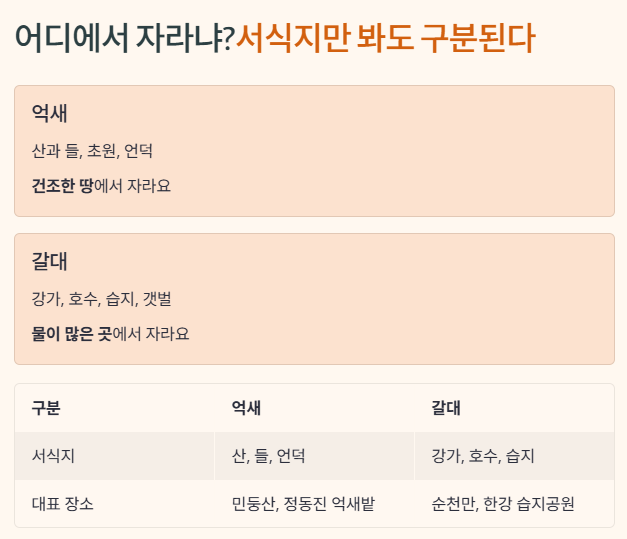 즉, 억새는 육지 식물, 갈대는 수변 식물이에요.