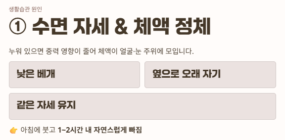 밤에 누워 있으면 중력 영향이 줄어들어 체액이 얼굴·눈 주위에 쉽게 모입니다.
