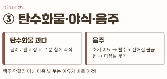 - 탄수화물 과다 섭취 → 글리코겐 저장 시 수분 함께 축적