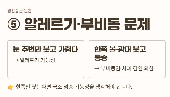 ✔ 한쪽 볼·광대가 붓고 통증 → 부비동염·치과 감염 의심