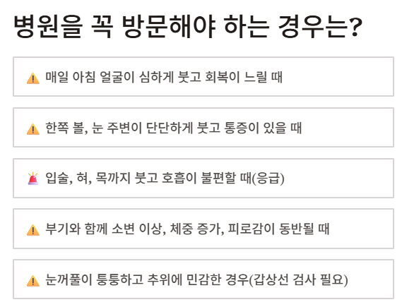 → 입술, 눈, 목까지 붓고 숨쉬기 어렵다면 즉시 병원으로! - 부비동염: 광대 주변, 눈 아래가 둔하게 붓고 누런 콧물, 두통 동반