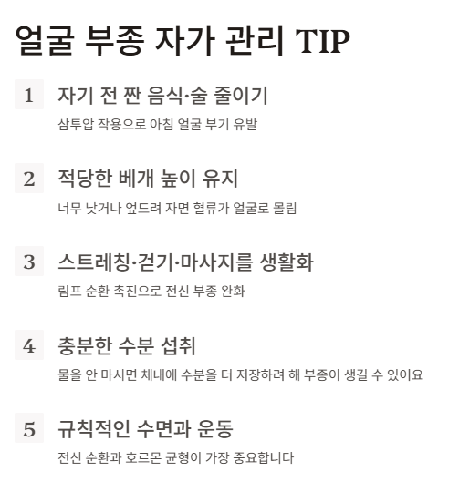 | 운동 부족·자세 | 혈액·림프 순환 저하로 얼굴 포함 전신 부종 유발 |