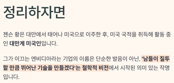 젠슨 황은 대만에서 태어나 미국으로 이주한 후, 미국 국적을 취득해 활동 중인 대만계 미국인입니다. 그가 이끄는 엔비디아라는 기업의 이름은 단순한 발음이 아닌, ‘남들이 질투할 만큼 뛰어난 기술을 만들겠다’는 철학적 비전에서 시작된 의미 있는 작명입니다.
