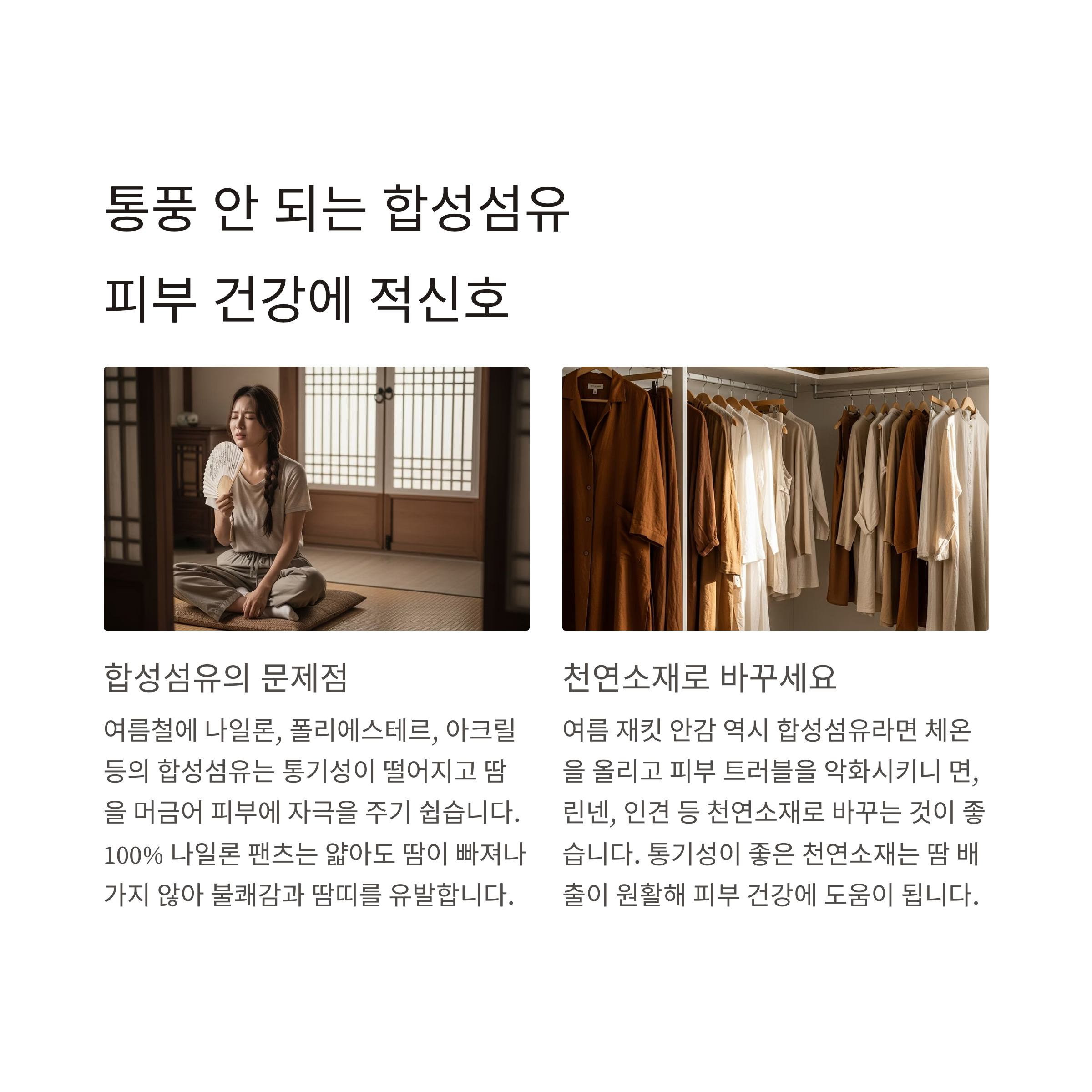 | 합성섬유 침구/의류 | 여름철 비추천 | 린넨, 면, 인견 소재 사용 |