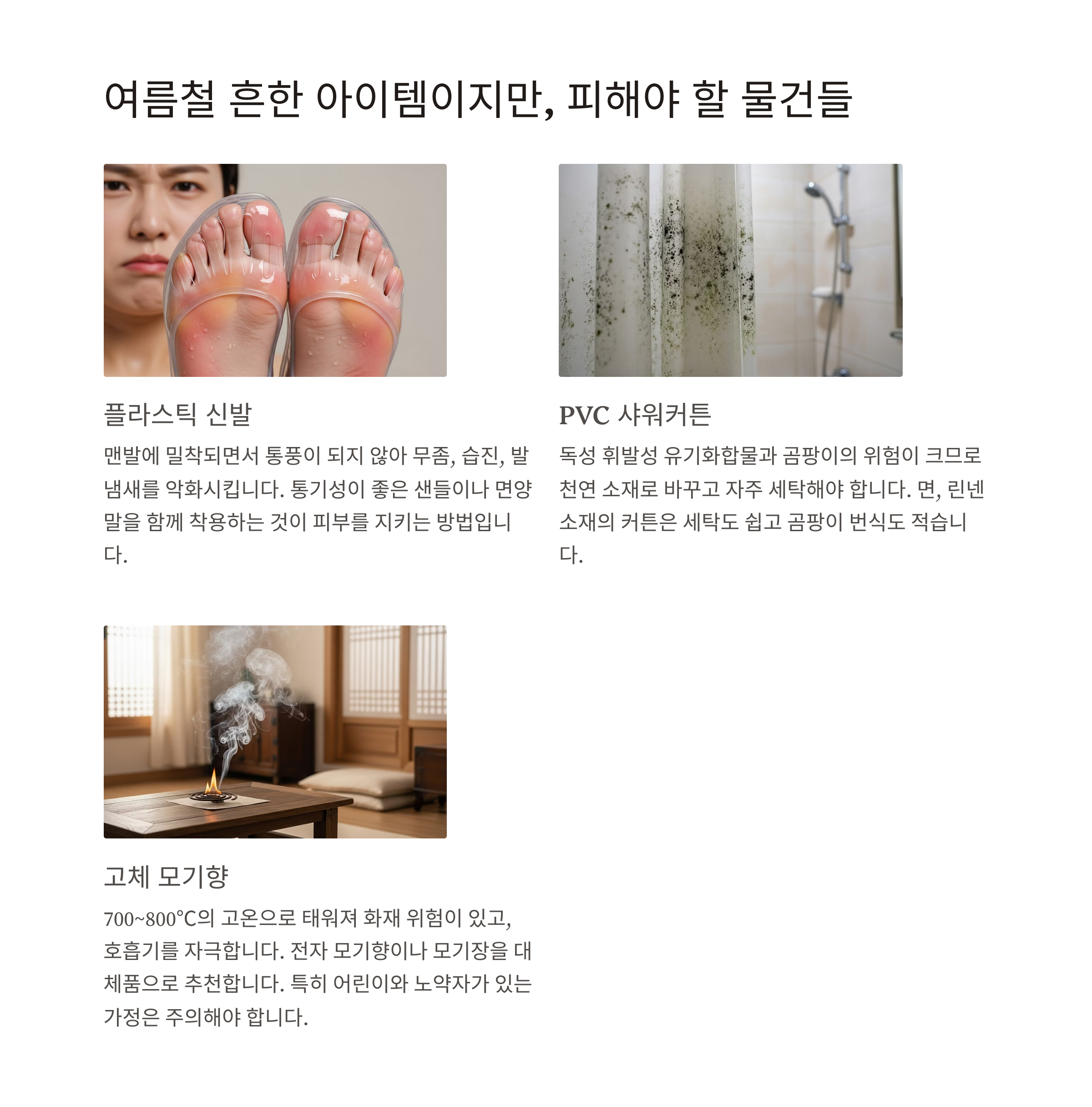| 합성섬유 침구/의류 | 여름철 비추천 | 린넨, 면, 인견 소재 사용 |