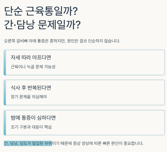 반면 담낭염·담석증은 갑자기 시작되는 극심한 통증이 특징이에요.