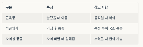 | 근육통 | 눌렀을 때 아픔 | 움직일 때 악화 |