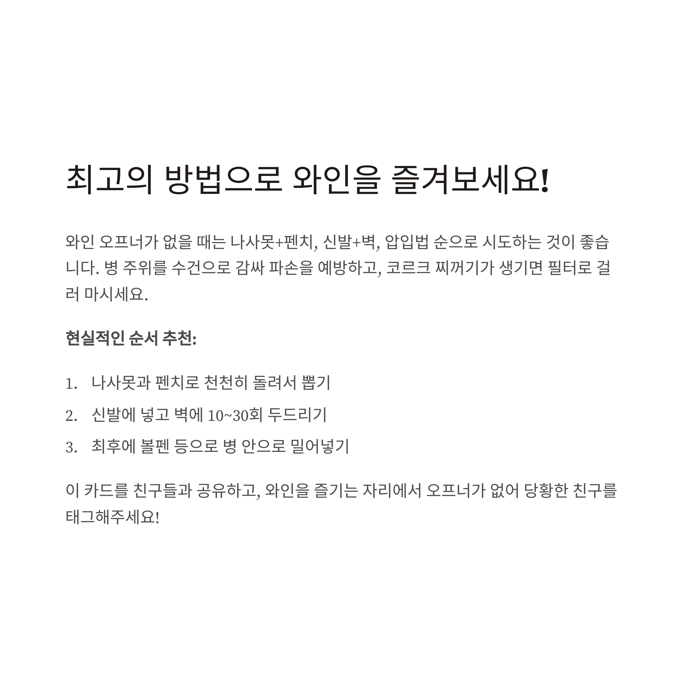 갑자기 와인 오프너가 없어 당황한 적 있으신가요? 집이나 캠핑장에서도 쉽게 구할 수 있는 도구들로도 와인을 열 수 있습니다. 나사못과 펜치, 신발과 벽, 그리고 마지막으로 병 안으로 밀어 넣는 방법까지, 성공률 높은 3가지 방법을 소개합니다. 각 방법의 준비물, 주의사항과 성공 팁까지 꼼꼼히 알려드리니 상황에 맞춰 시도해 보세요.