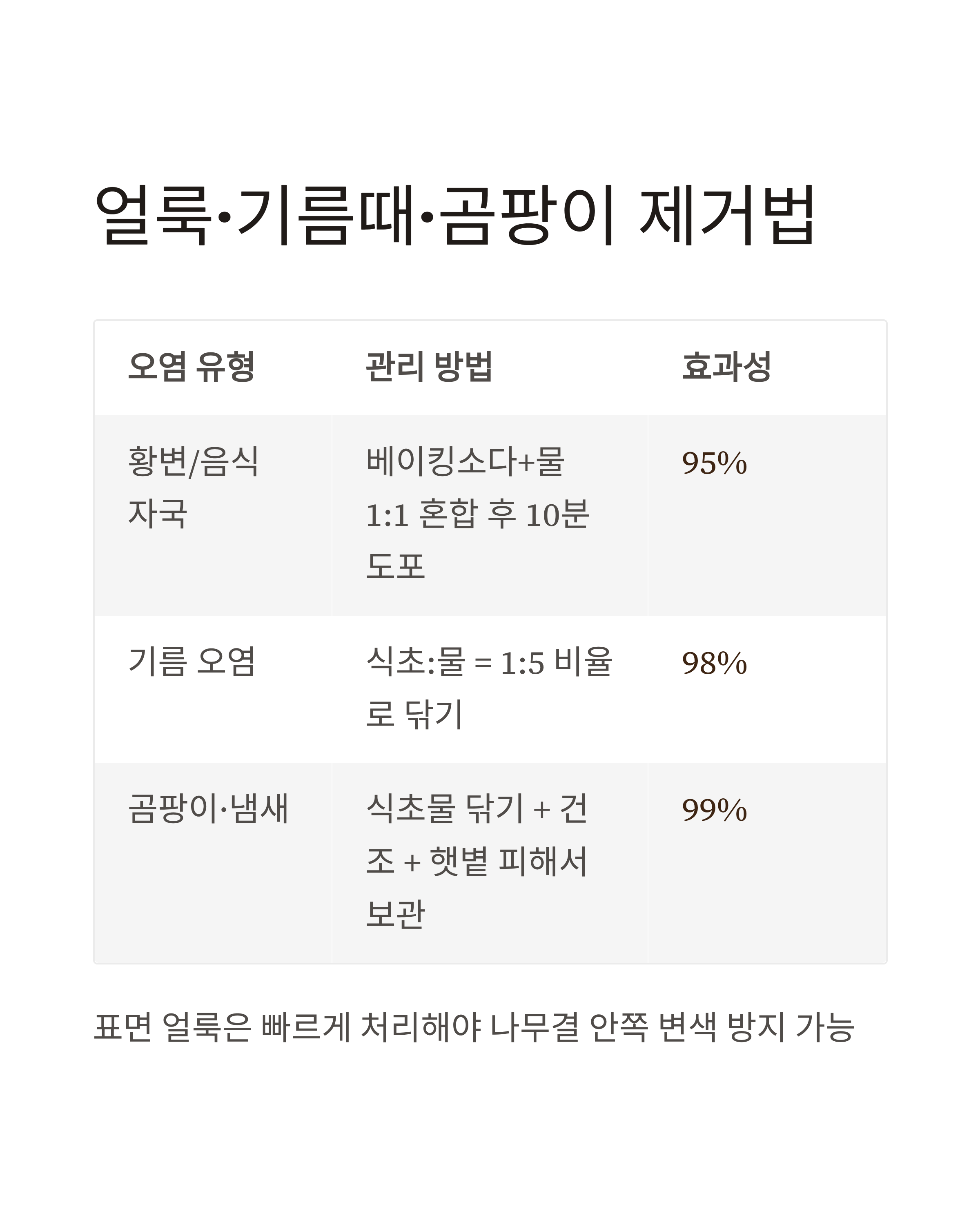 | 기름 오염 | 식초:물 = 1:5 비율로 닦은 후 마른 천으로 마무리 | 98 |