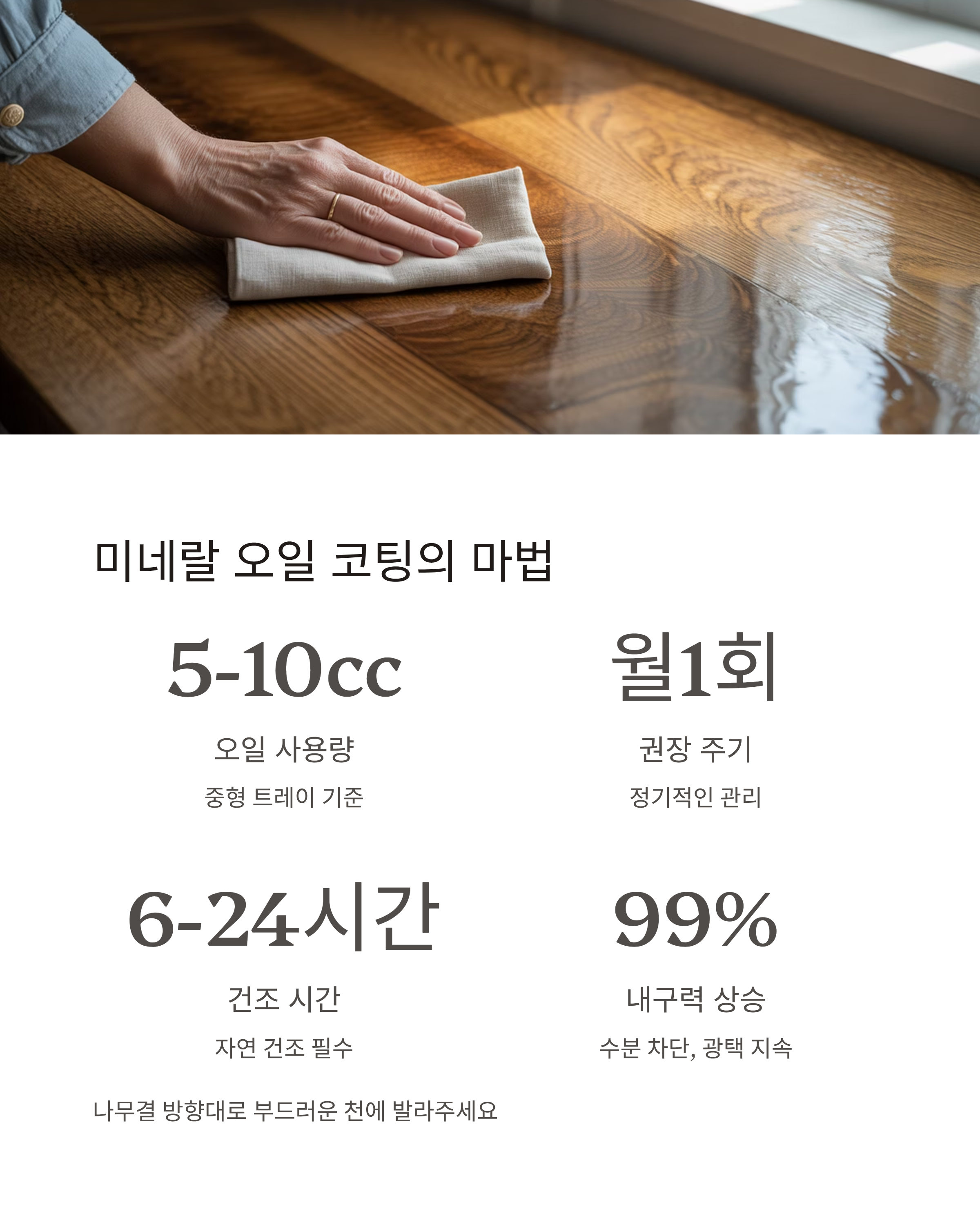 - 월 1회 미네랄 오일 코팅 + 최소 6시간 이상 건조