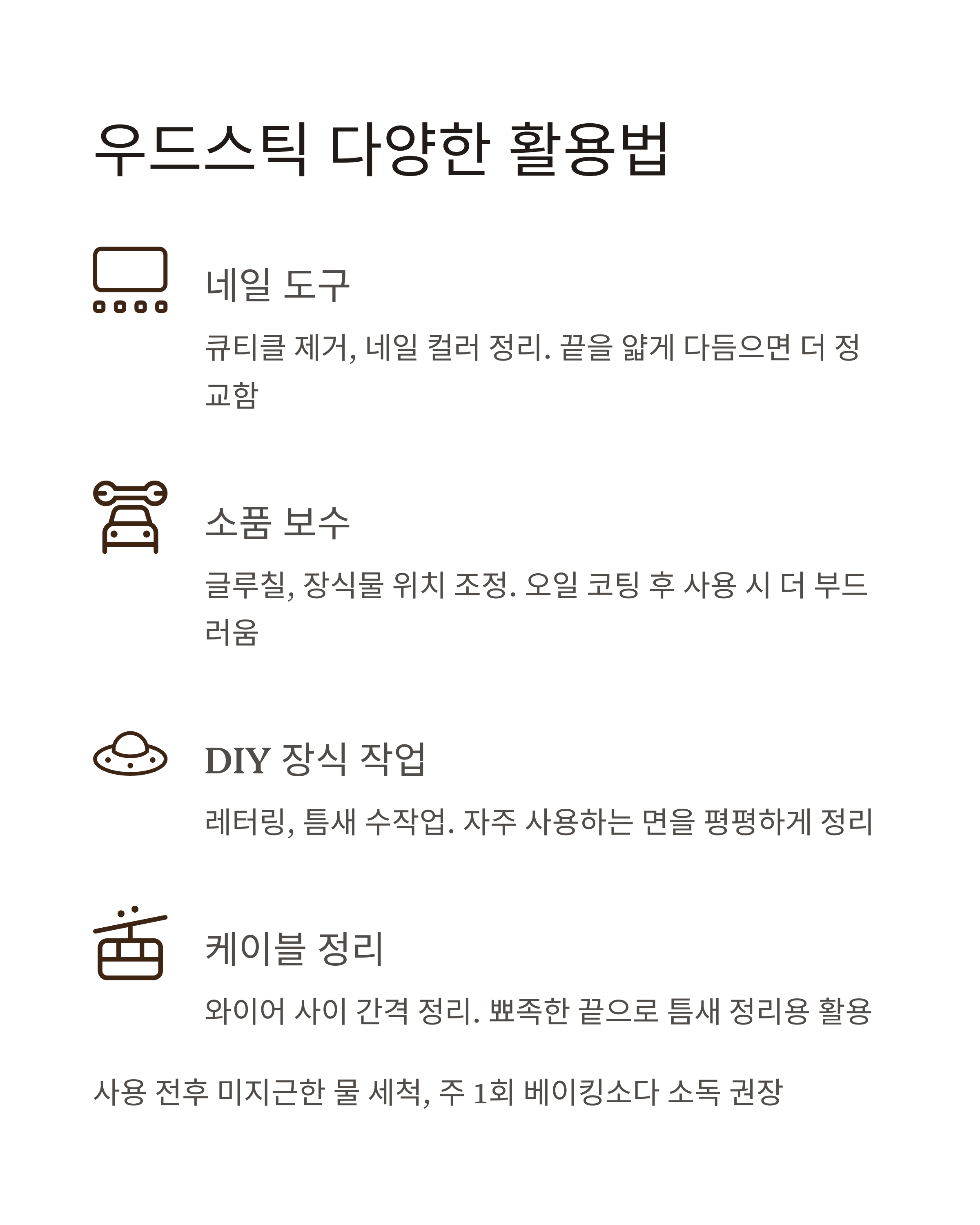 | DIY 장식 작업 | 레터링, 틈새 수작업 | 자주 사용하는 면을 평평하게 정리 |