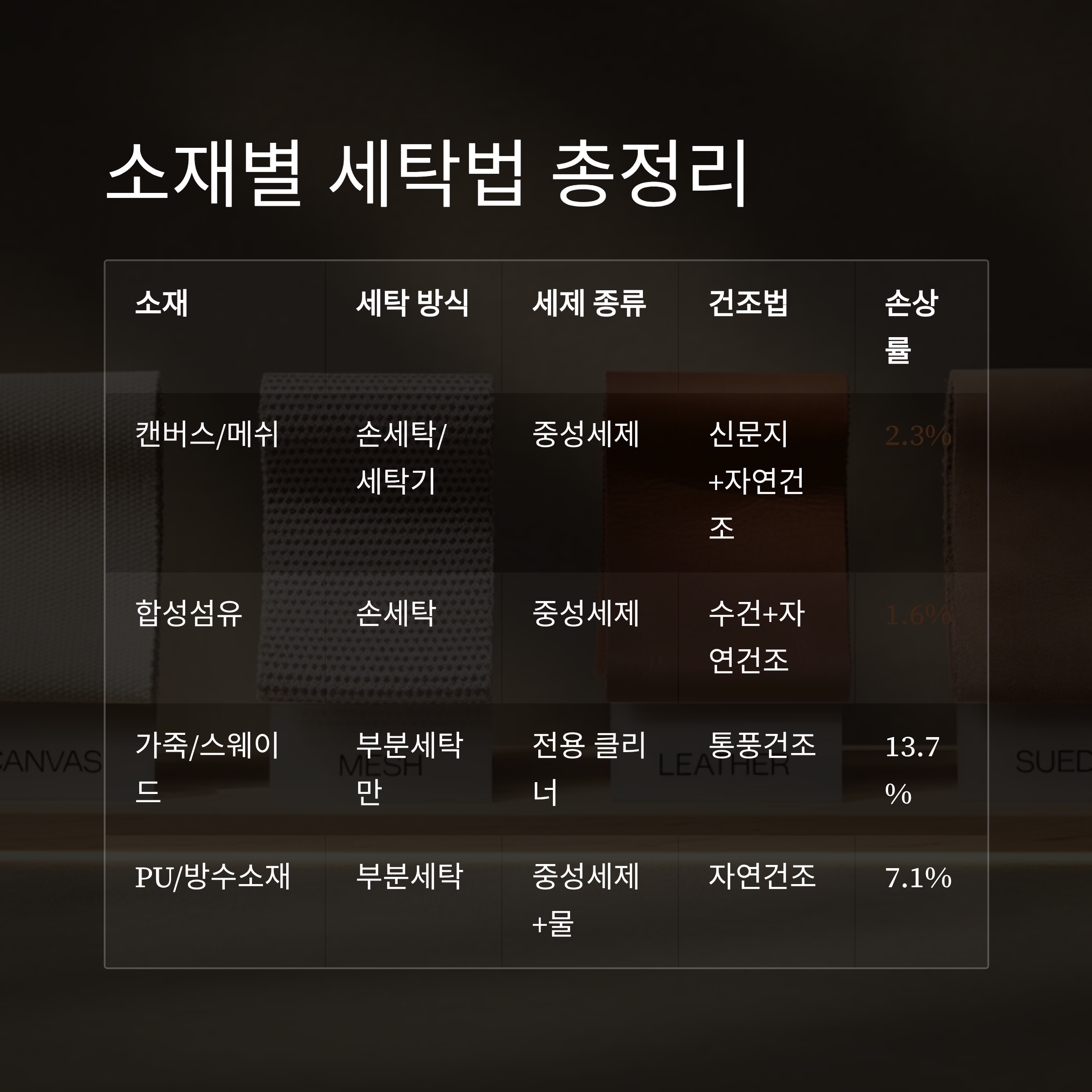 | 캔버스/메쉬 | 손세탁/세탁기 | 중성세제/베이킹소다 | 신문지+자연건조 | 2.3% |
