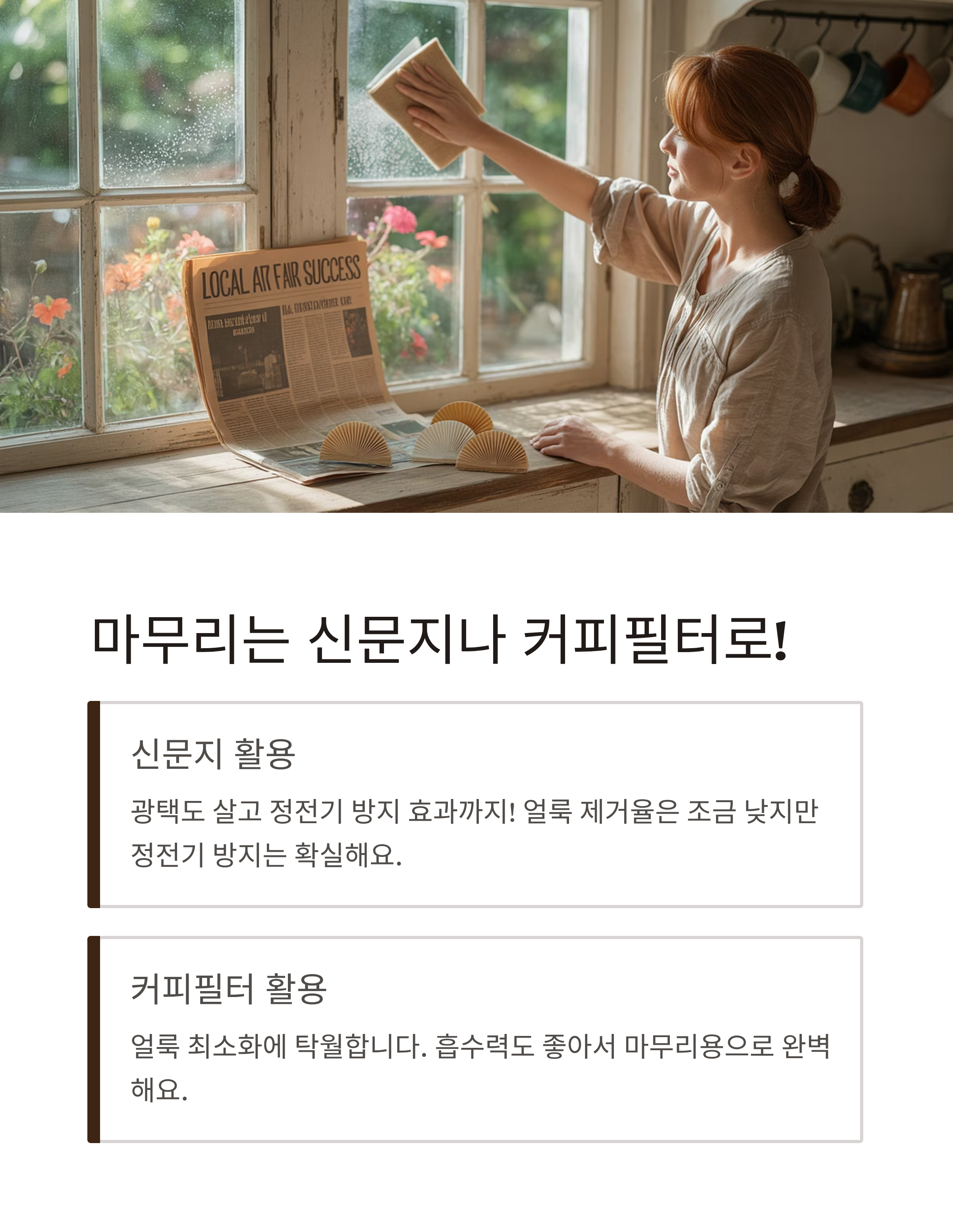 극세사보다 신문지가 얼룩 제거율이 조금 낮지만, 정전기 방지 효과는 확실히 좋다고 해요. 커피필터도 얼룩 최소화에 탁월합니다.