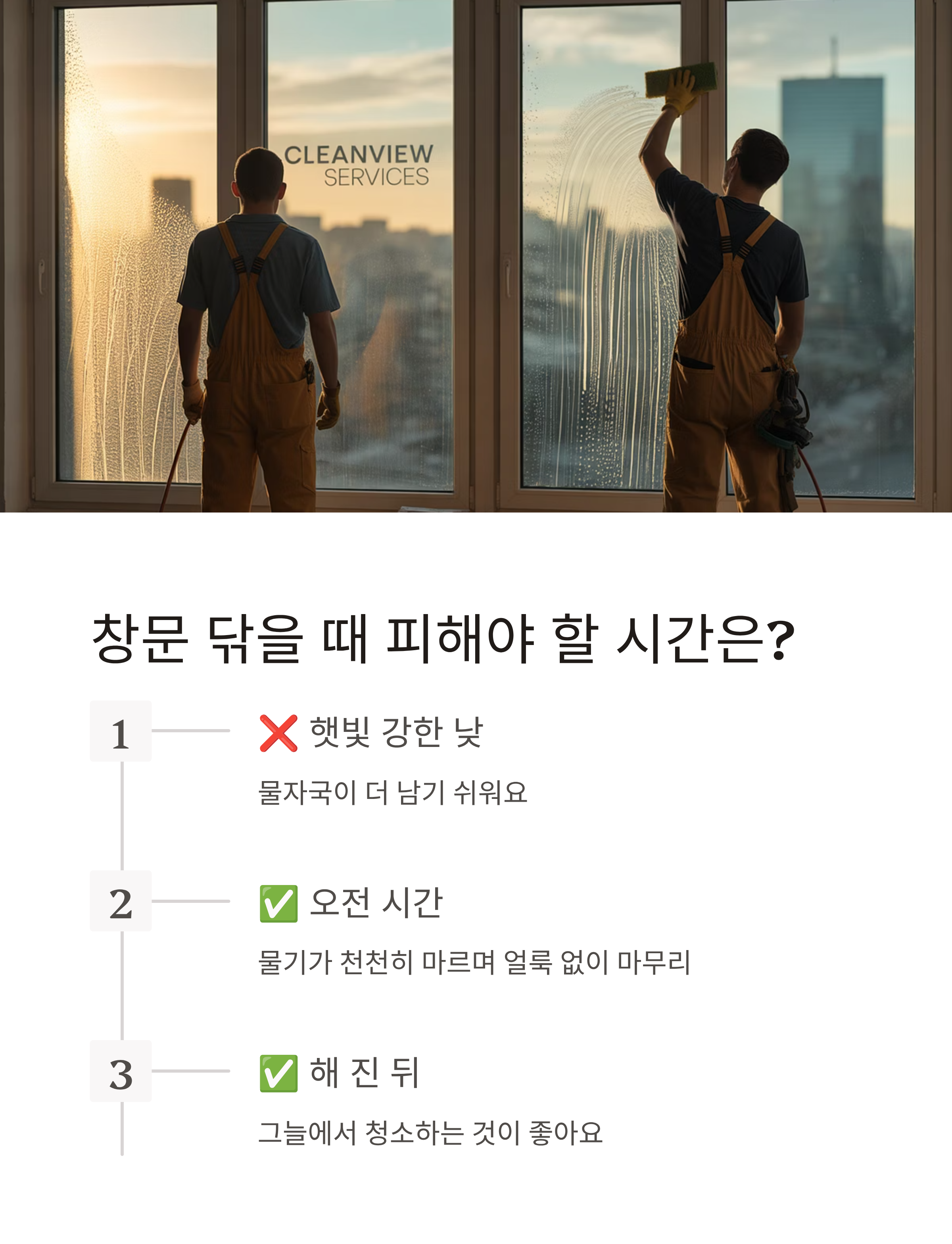 가장 많이 하는 실수 중 하나가 '햇빛 강한 낮 시간'에 청소하는 거예요. 이때 닦으면 물자국이 더 남기 쉽습니다.