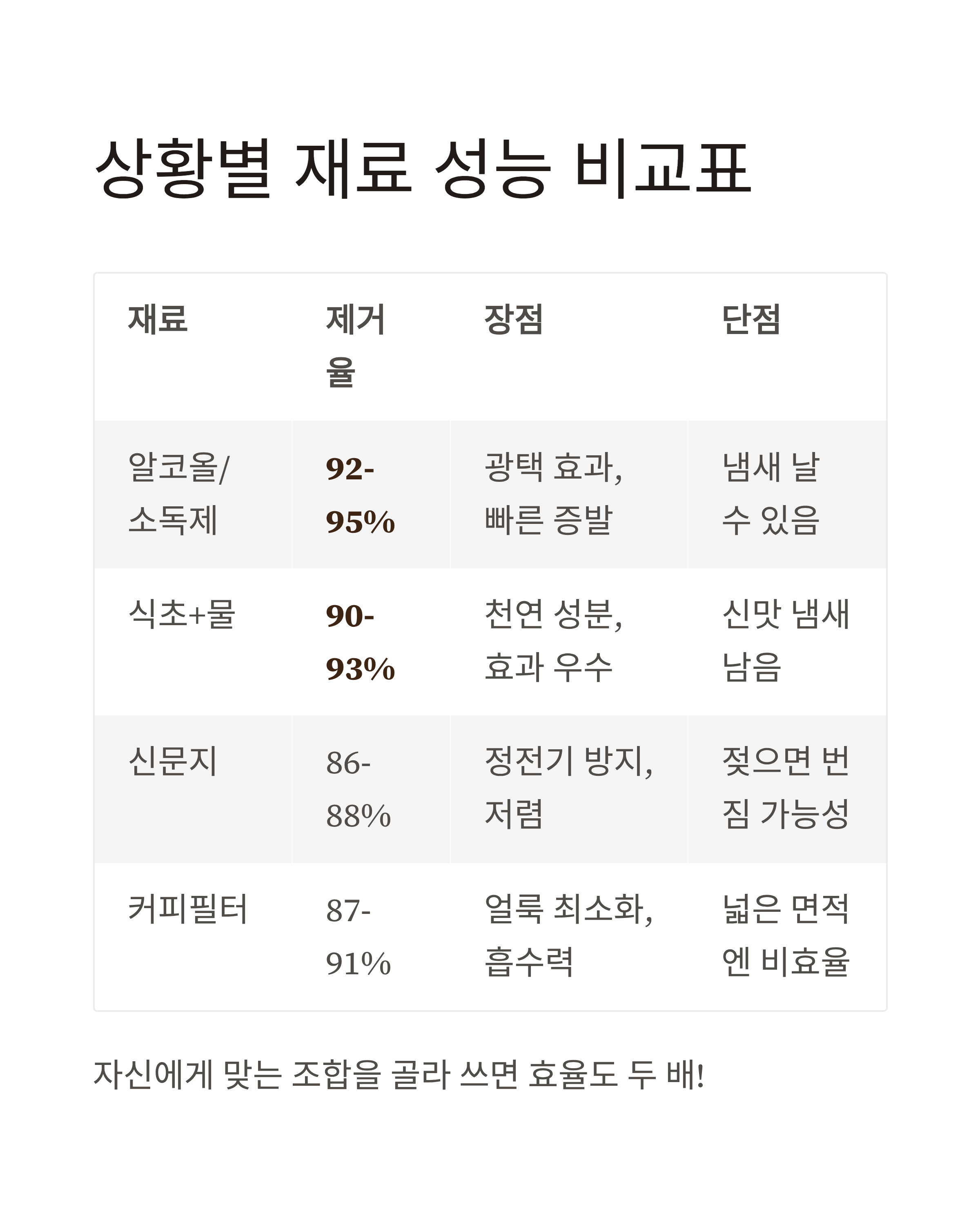 | 알코올/소독제 | 92~95% | 광택 효과, 빠른 증발 | 냄새가 날 수 있음 |