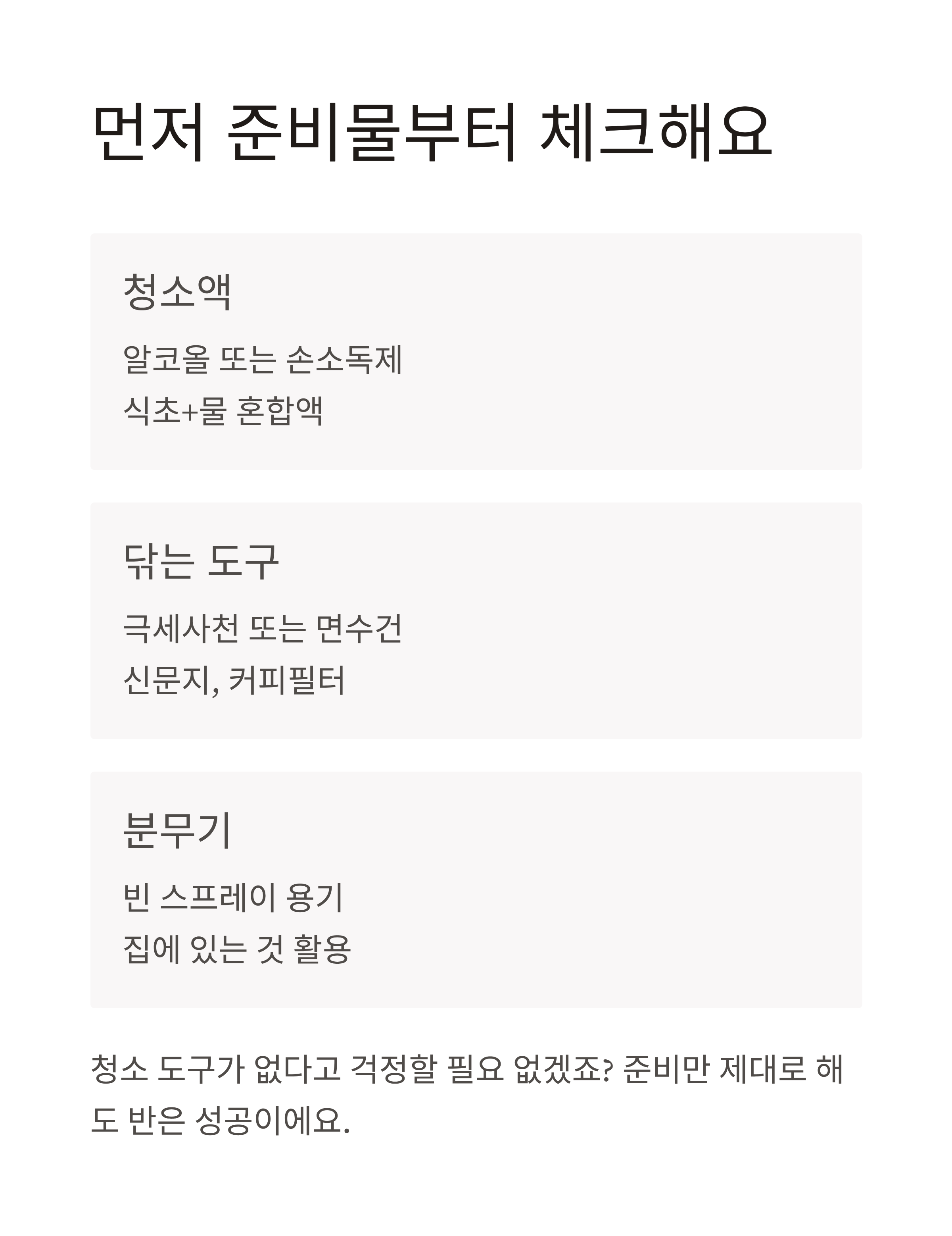 청소 도구가 없다고 걱정할 필요 없겠죠? 준비만 제대로 해도 반은 성공이에요.