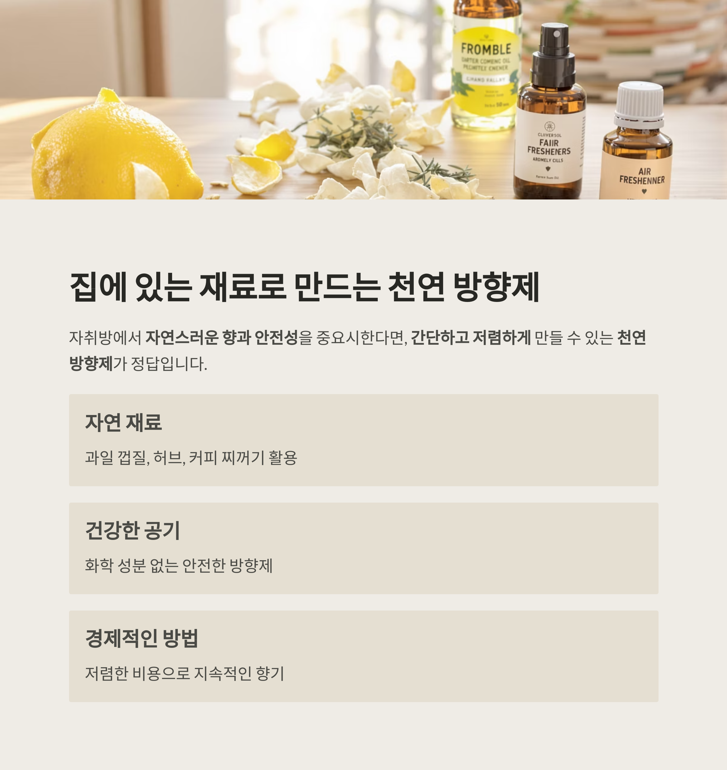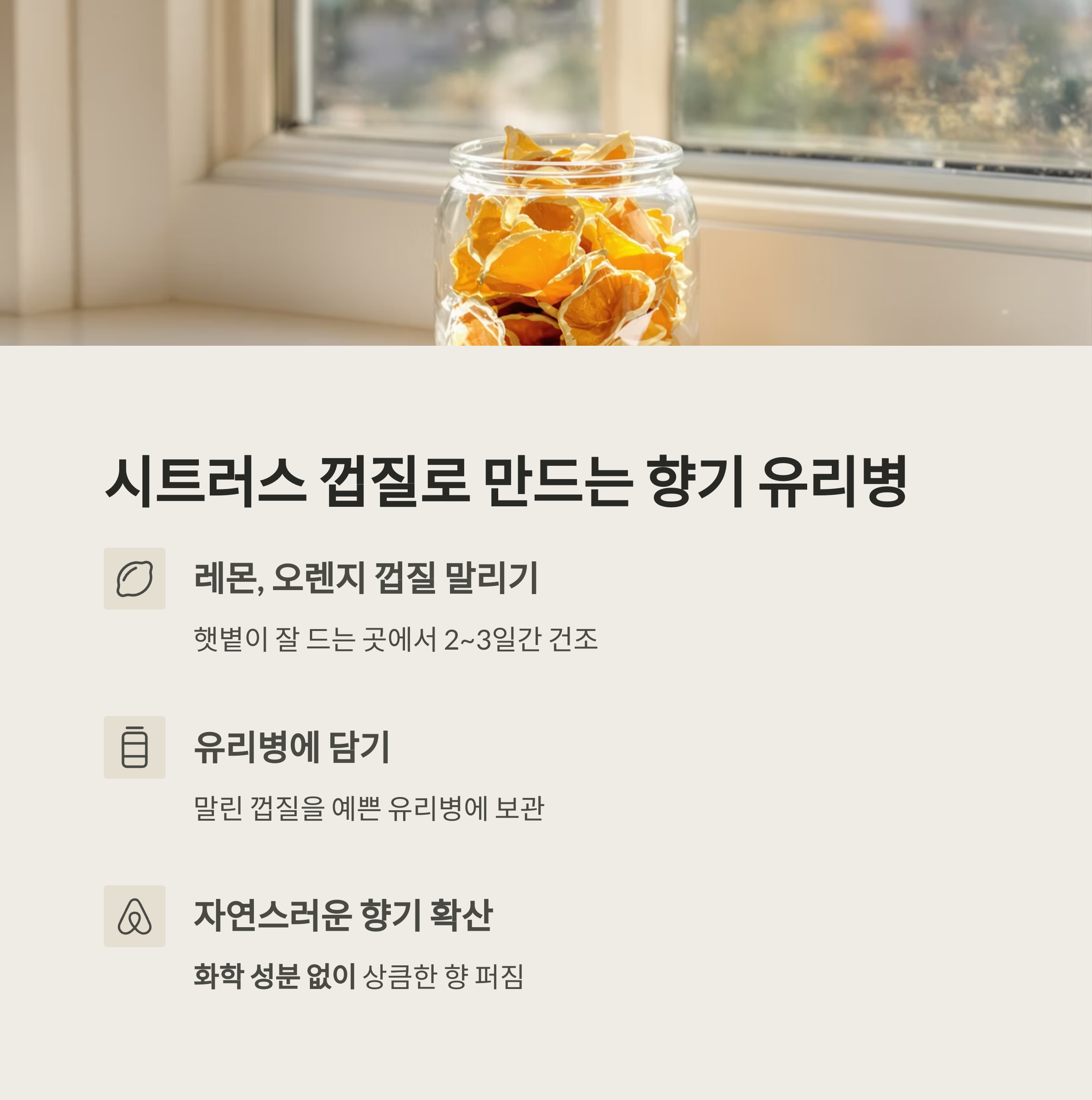집에서 쉽게 구할 수 있는 재료로 화학 성분 없이도 안전하게 향기로운 공간을 만들 수 있는 방법을 소개합니다.