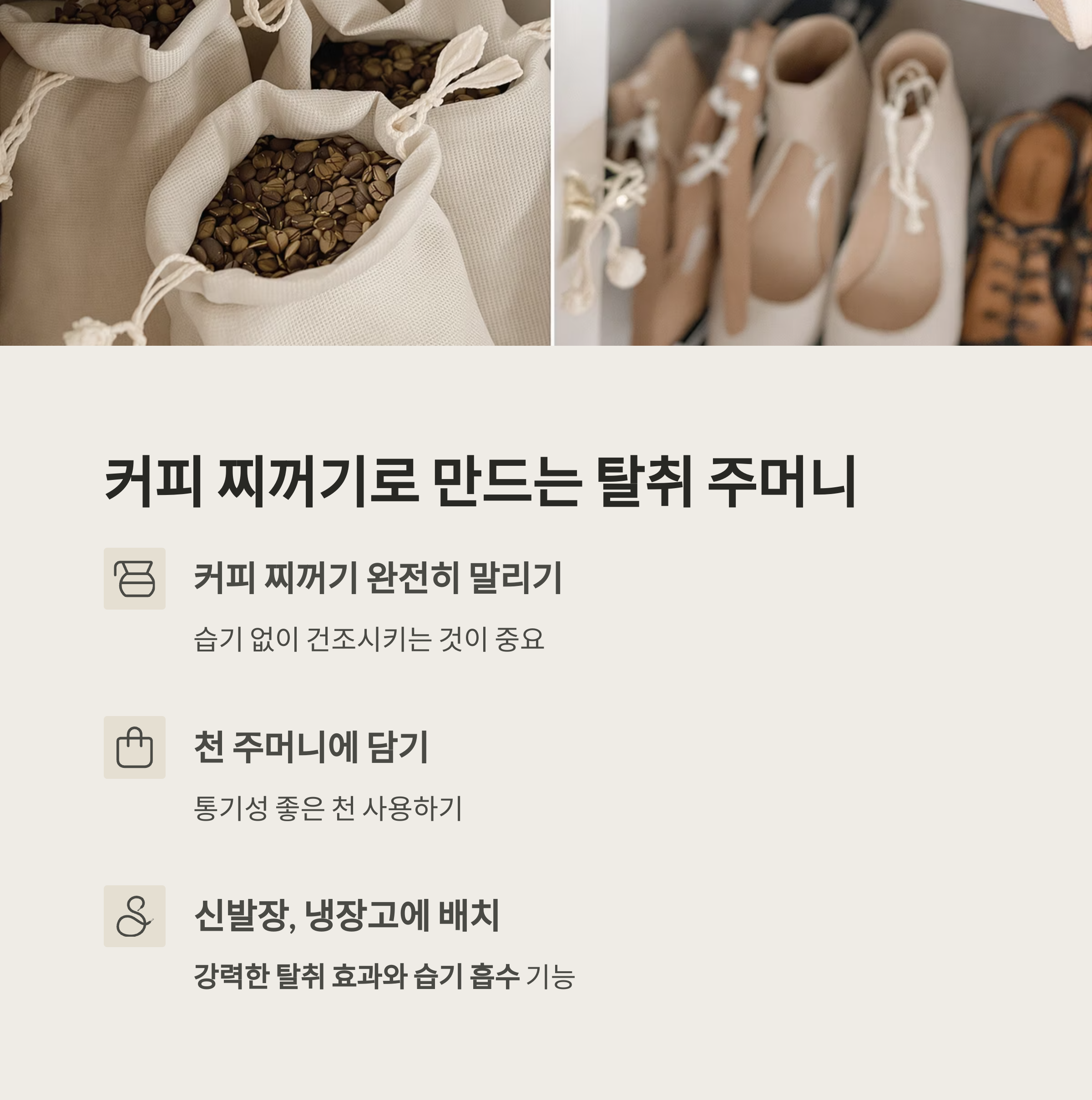 | 커피 찌꺼기형 | 말린 커피 찌꺼기 | 냉장고, 신발장 | 냄새 제거, 습기 흡수 |