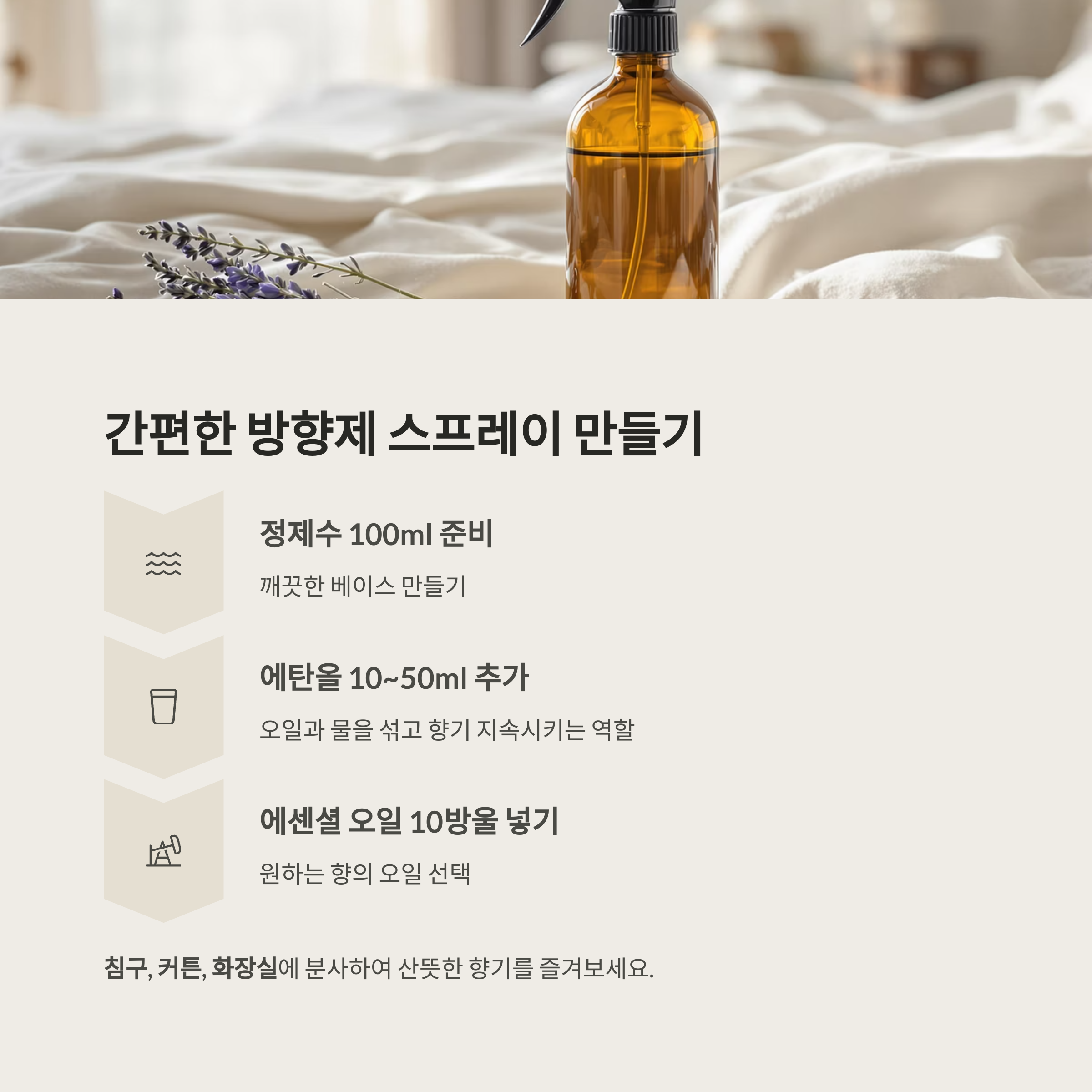 | 스프레이형 | 정제수, 에탄올, 오일 | 화장실, 침구 | 빠른 확산과 지속력 |
