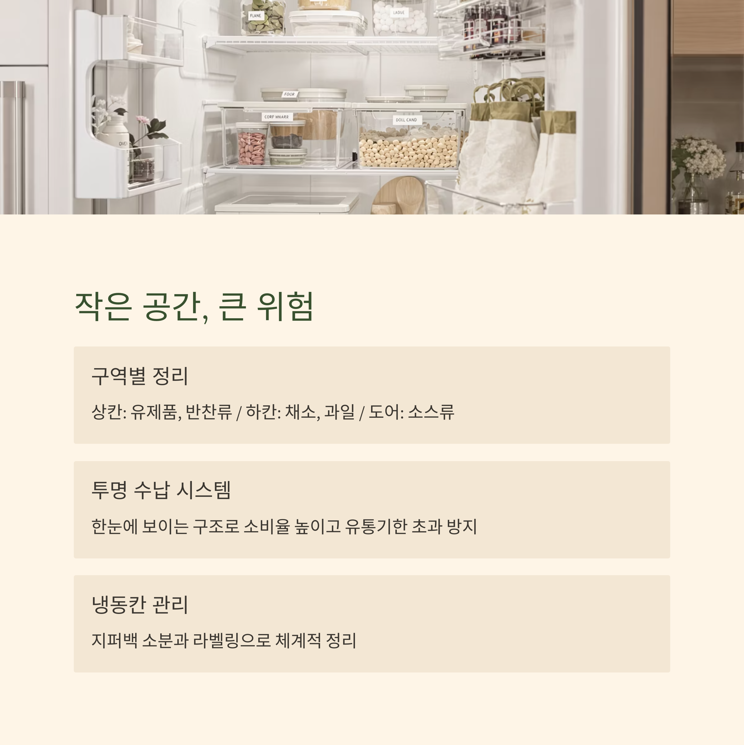 - 투명용기, 분리트레이, 라벨링으로 시각적 정리