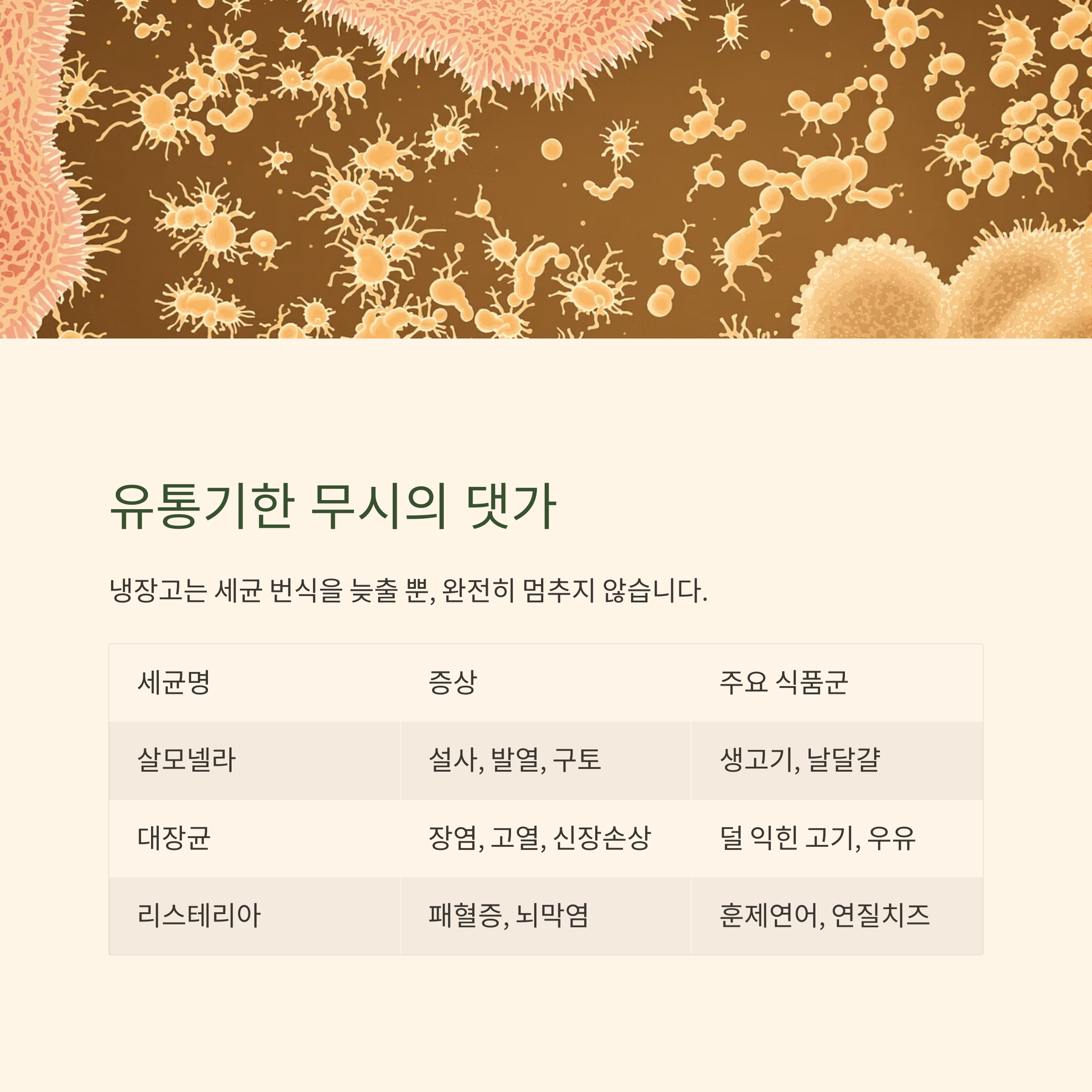 특히 아래 식중독 세균은 유통기한 초과 시 폭발적으로 증식합니다