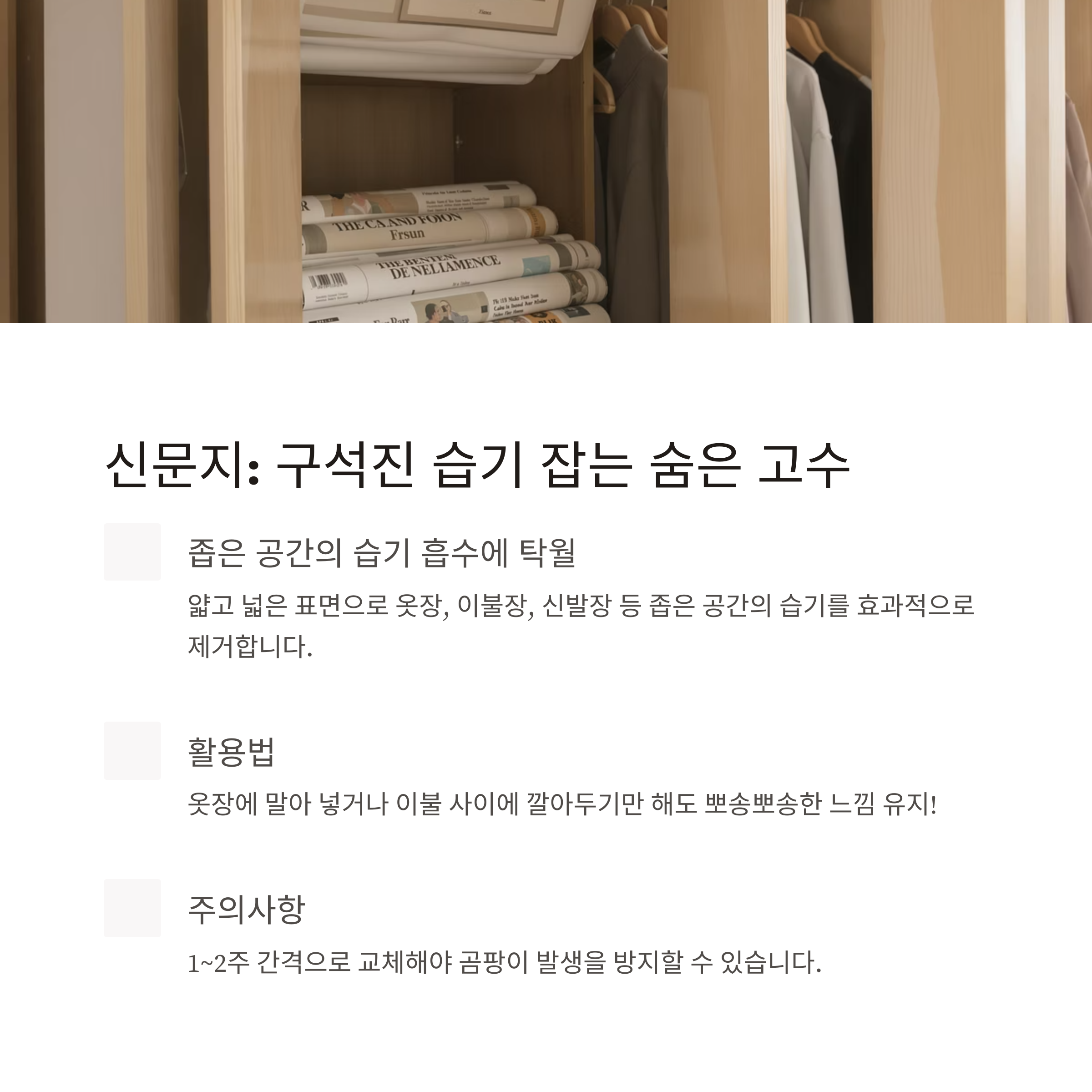 | 신문지 | 습기 흡수 | 옷장, 서랍, 이불장 등 | 1~2주마다 교체 | 0 |