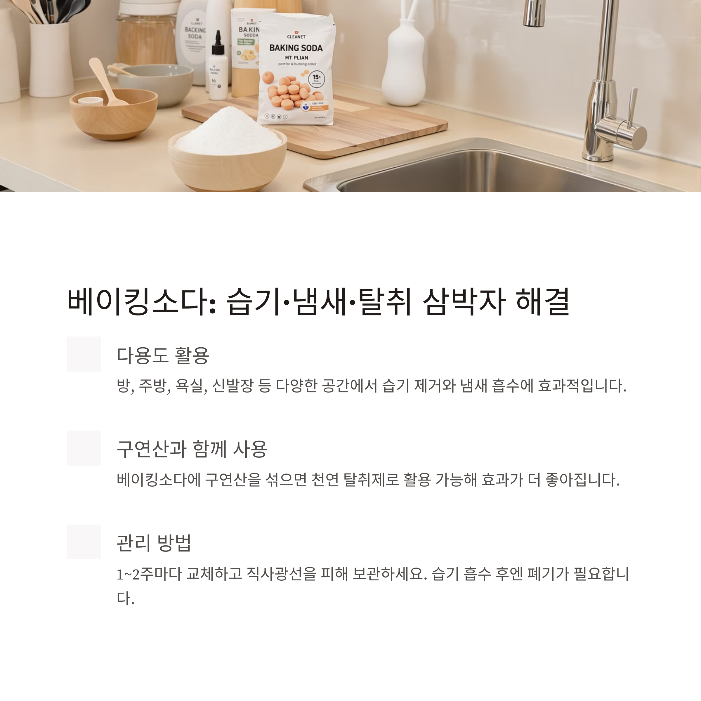 | 베이킹소다 | 습기+냄새 | 방, 주방, 배수구 등 | 1~2주 후 폐기, 서늘한 곳에 보관 | 3,000~5,000 |