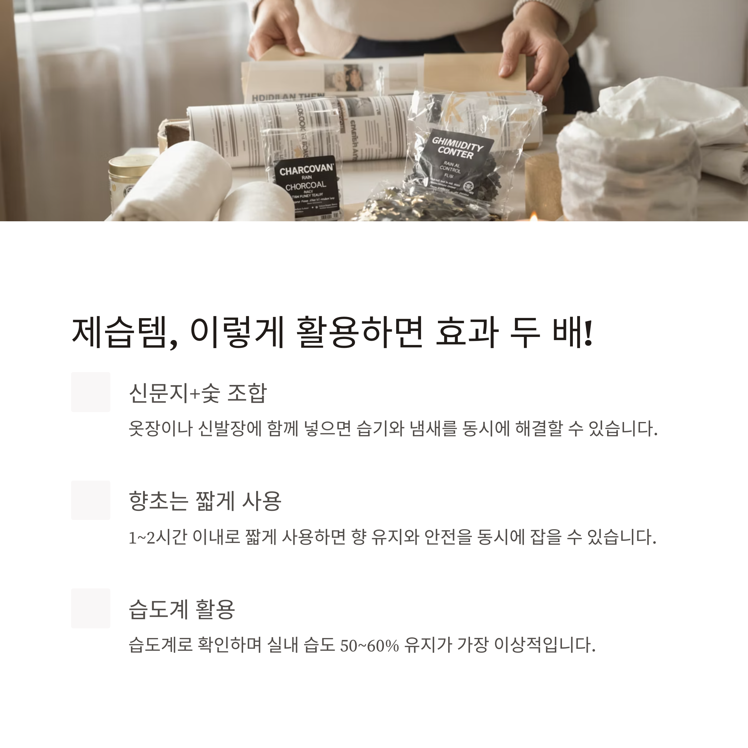 - 신문지+숯 함께 사용: 옷장이나 신발장엔 두 가지를 같이 넣으면 습기와 냄새를 동시에 해결할 수 있습니다