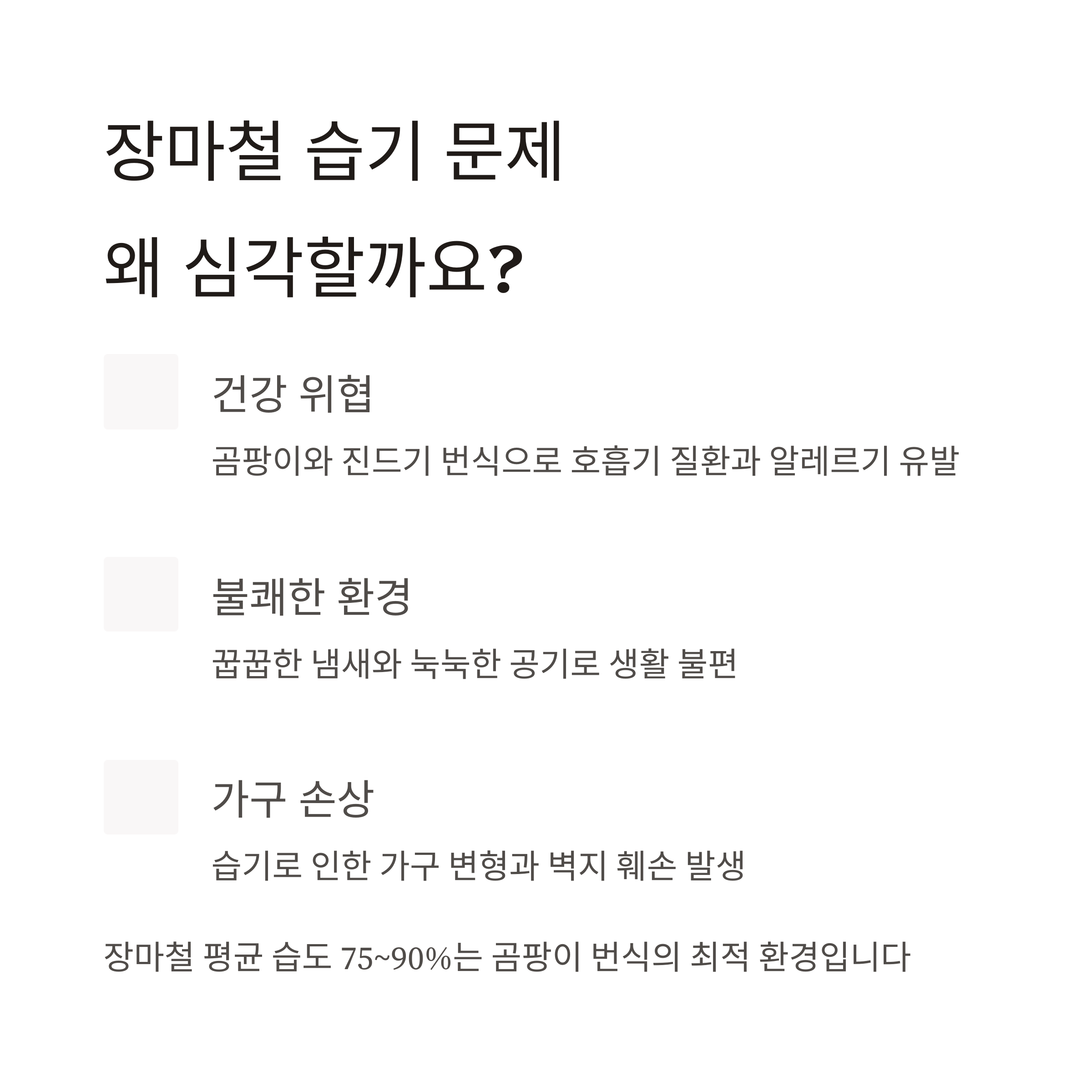 장마철이 되면 실내 습도는 급격히 높아지고, 이로 인해 곰팡이, 진드기, 꿉꿉한 냄새 등 다양한 불쾌한 문제가 발생합니다.