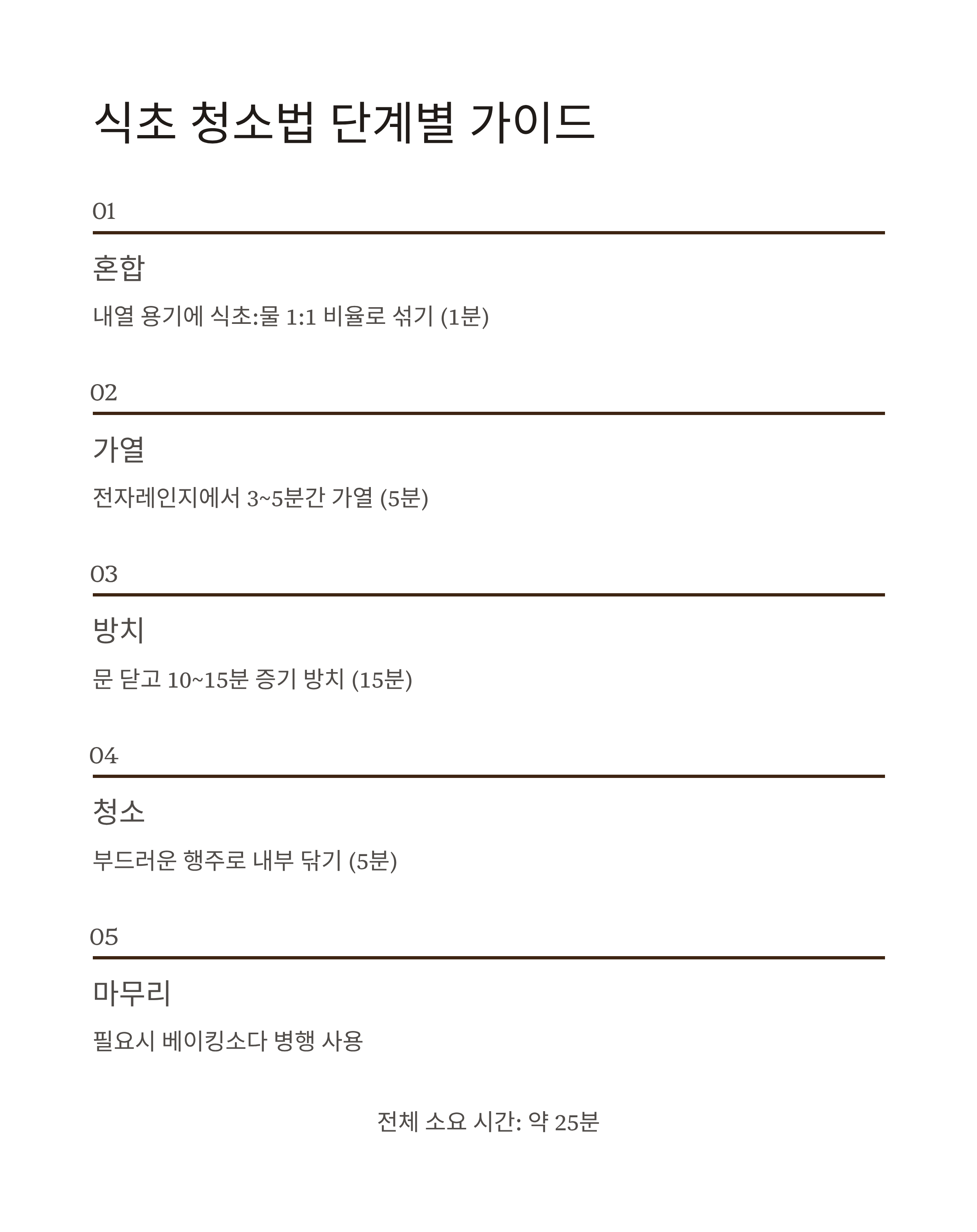 | 1단계 | 내열 용기에 식초:물 1:1 또는 2:1 비율 혼합 | 1분 |