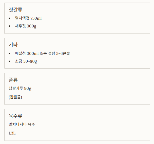 | 멸치액젓 | 750ml | 기호 따라 까나리액젓으로 일부 대체 가능 |