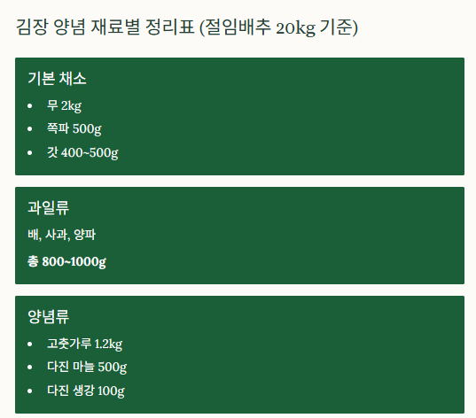 김장 양념 재료별 정리표 (절임배추 20kg 기준)