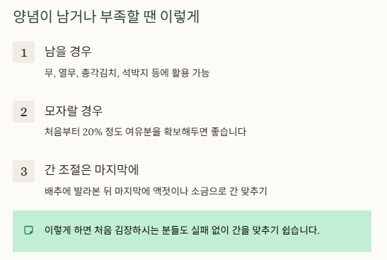- 남을 경우: 무, 열무, 총각김치, 석박지 등에 활용 가능