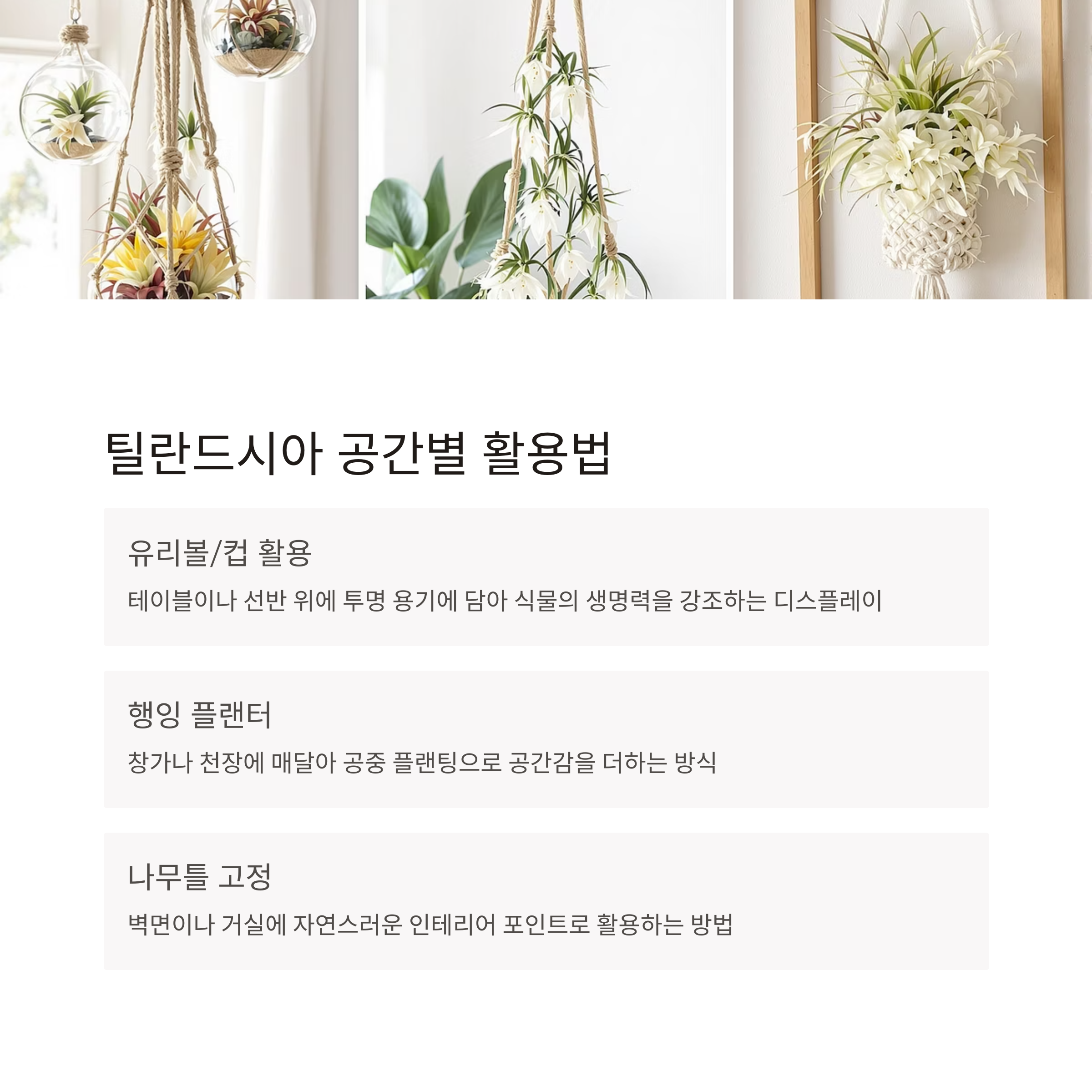 아래는 대표적인 틸란드시아 인테리어 방법을 정리한 표입니다.