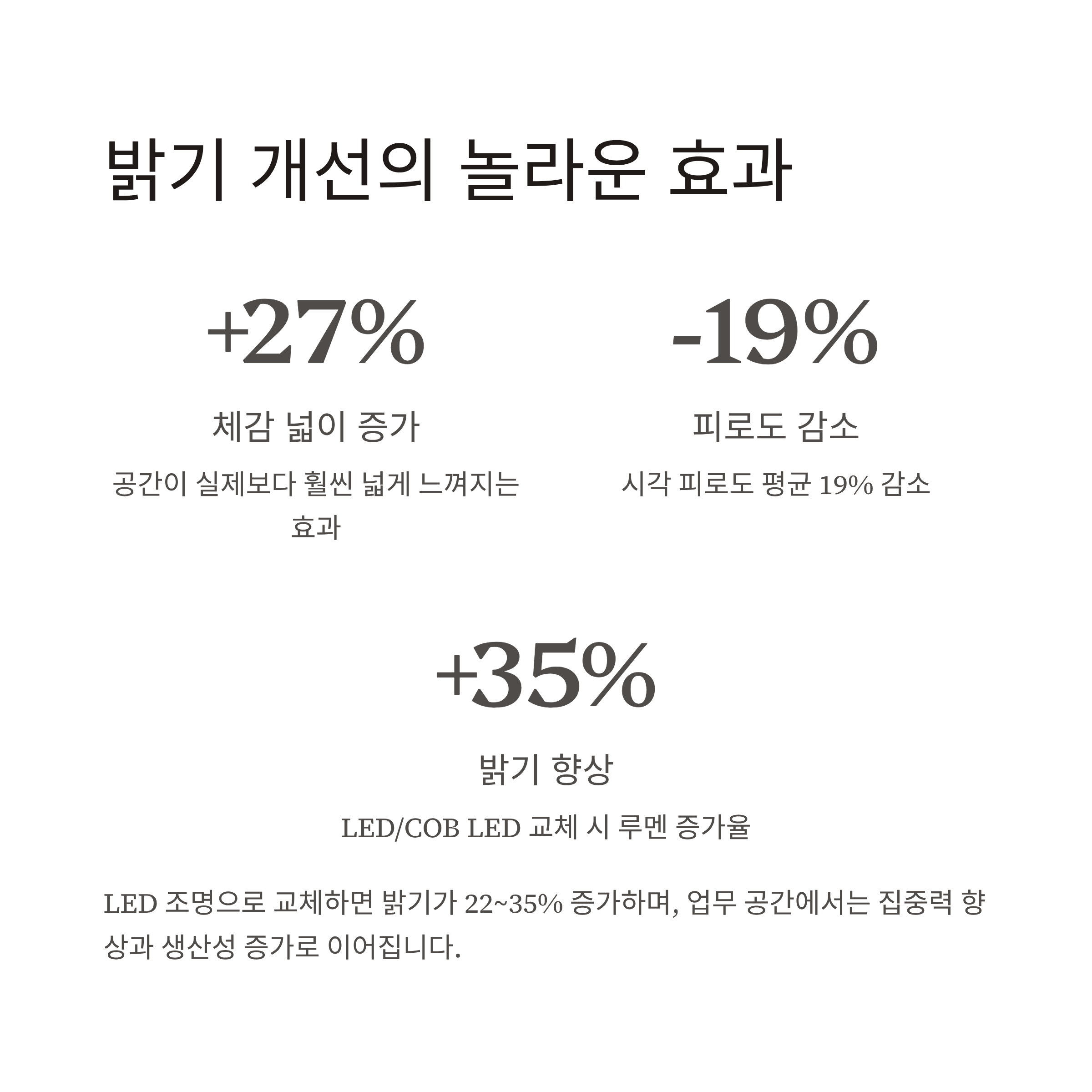 또한 밝기 개선만으로 시각 피로도가 평균 19% 감소했고, 특히 업무 공간에서는 집중력 향상과 생산성 증가로 이어졌습니다.