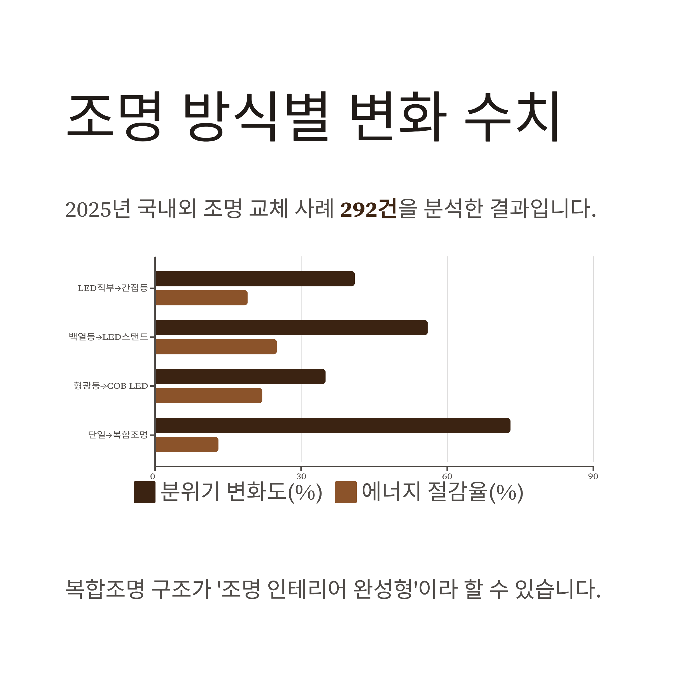 아래 표는 2025년 국내외 조명 교체 사례 292건을 정리한 것입니다. 조명 방식이 바뀌는 순간, 분위기와 에너지 효율성이 어떻게 달라지는지 보여줍니다.