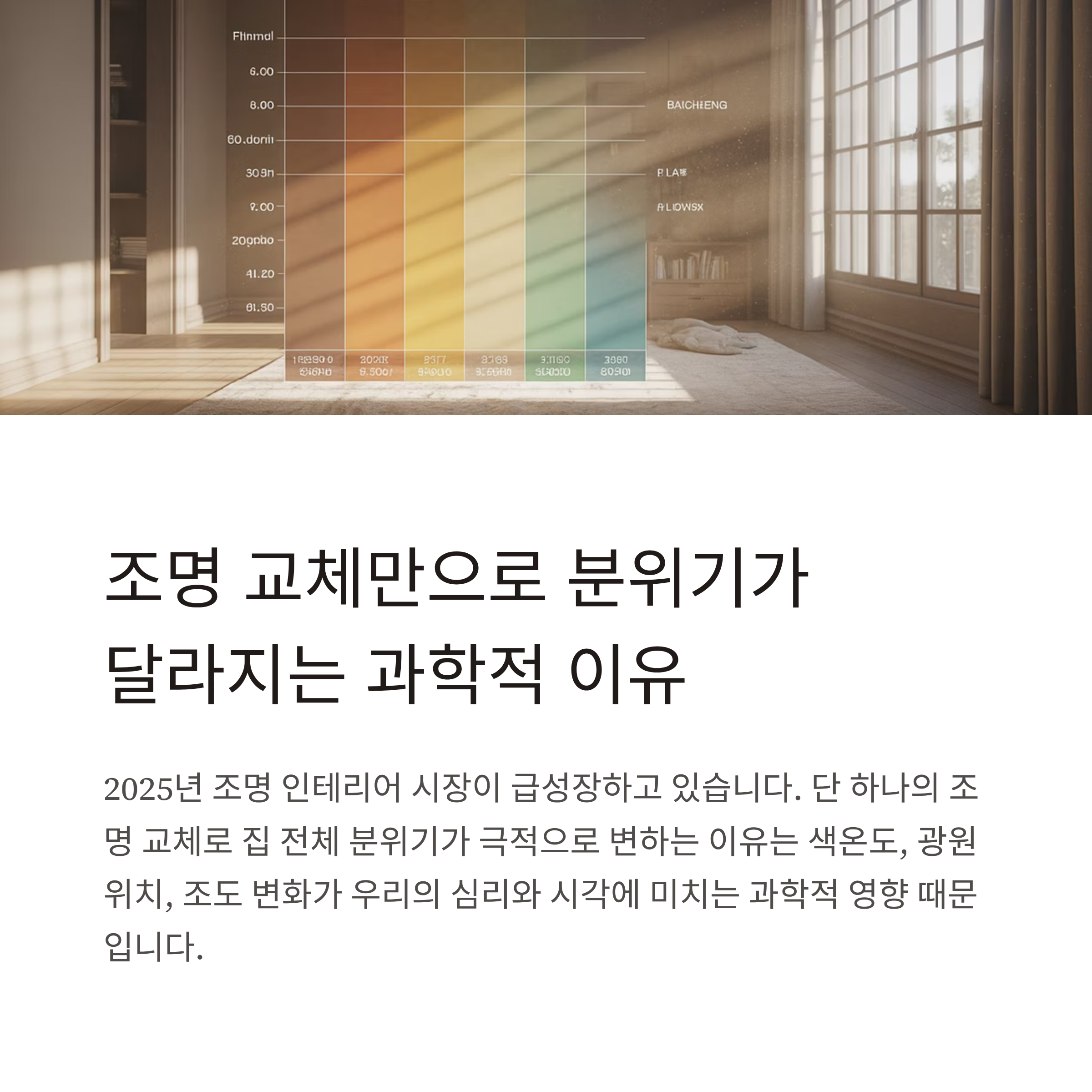 2025년 조명 인테리어 시장이 빠르게 커지고 있습니다. 놀랍게도 단 하나의 조명만 교체해도 집 전체 분위기가 극적으로 바뀌는 사례가 속출하고 있는데요. 그 이유는 단순한 감성이 아니라, 색온도, 광원 위치, 조도 변화가 우리의 심리와 시각 반응에 미치는 과학적인 영향 때문입니다. 이번 글에서는 국내외 최신 데이터를 바탕으로, 조명 교체가 공간에 미치는 변화와 그 핵심 포인트를 구체적으로 풀어드립니다.