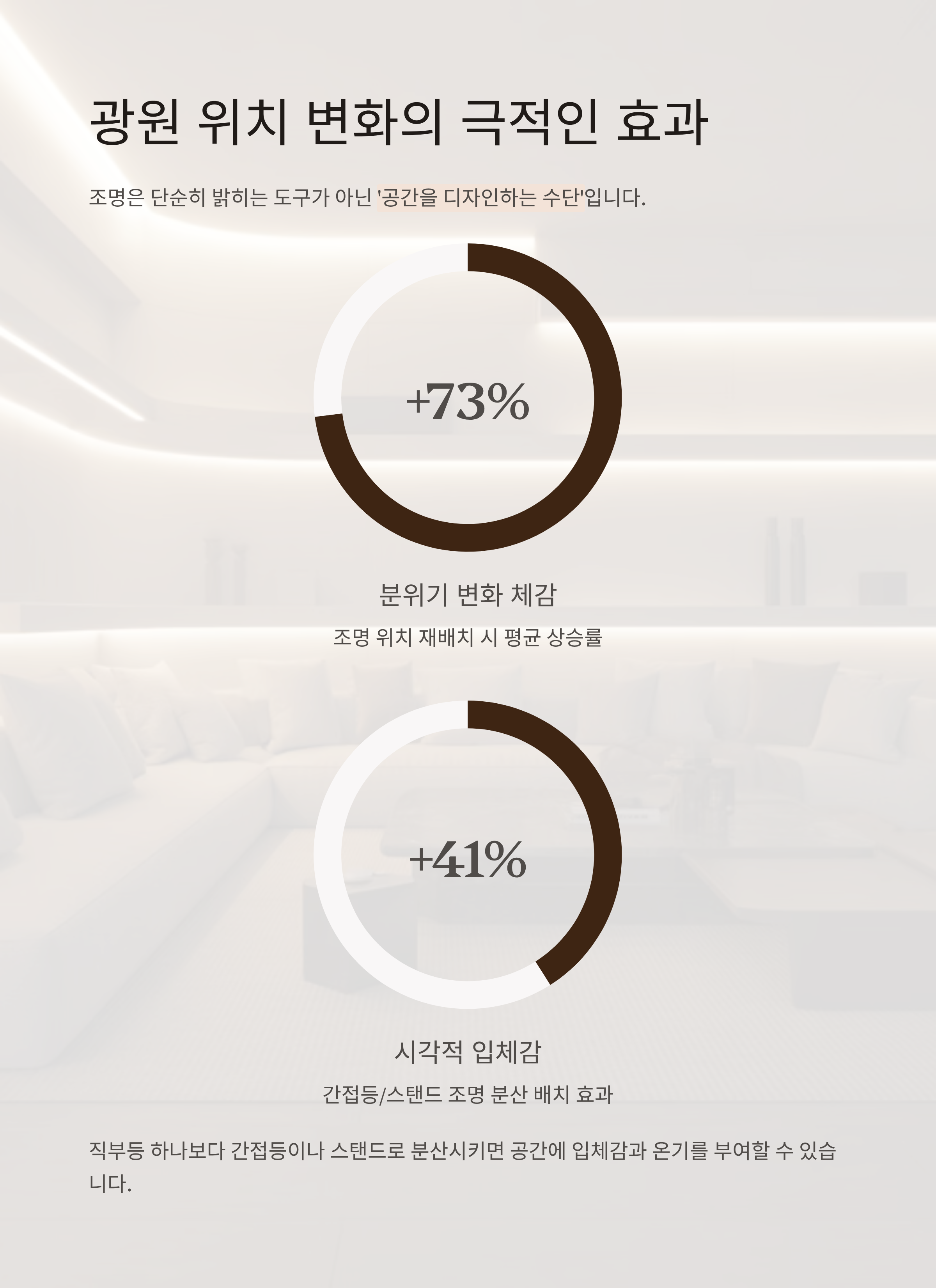 데이터에 따르면, 조명 위치를 재배치한 경우 분위기 변화 체감이 평균 73%까지 올라갔고, 시각적 입체감도 41% 증가했다고 하니 놀랍죠?