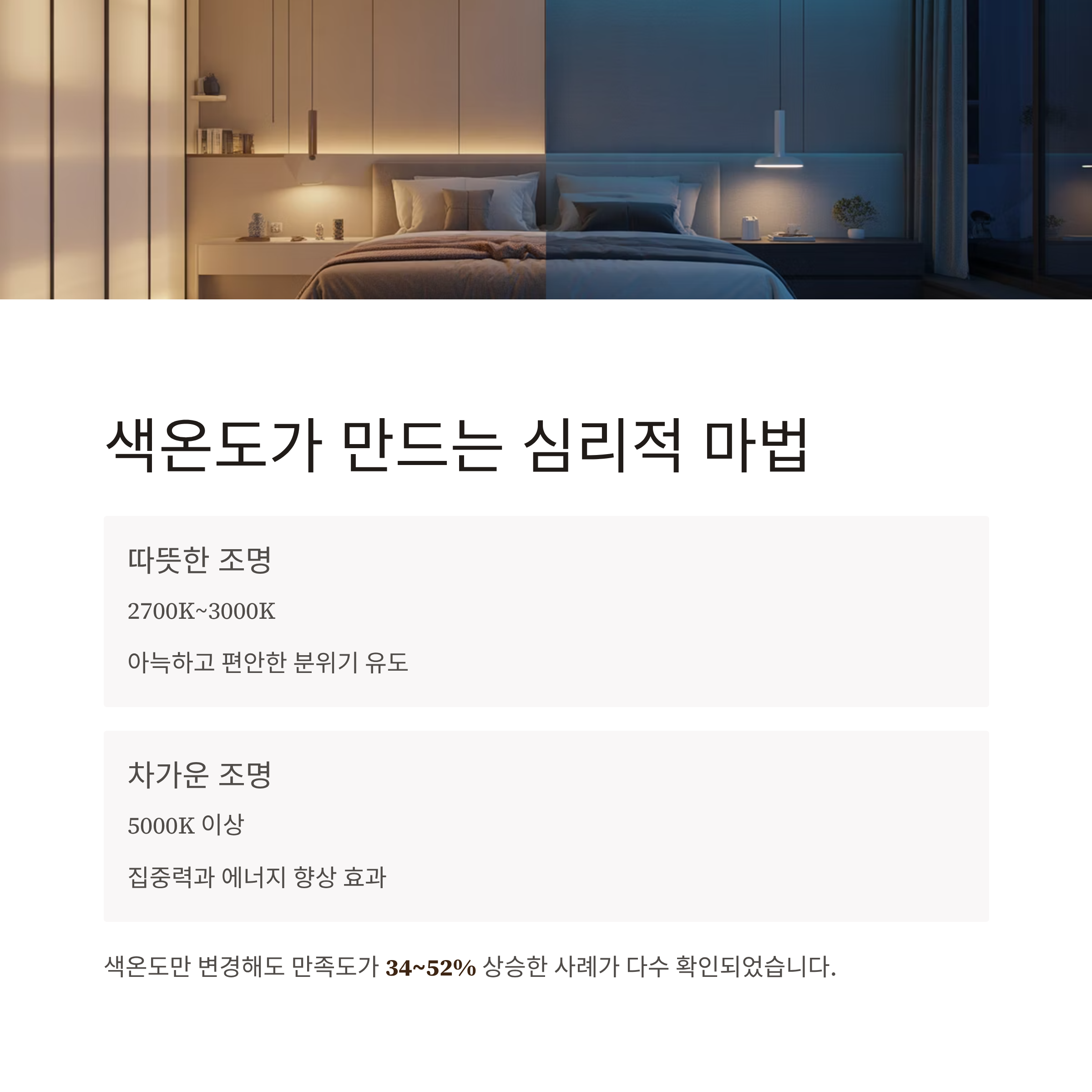 조명 색온도만 바꿨을 뿐인데 만족도가 무려 34~52%까지 올라간 사례도 많습니다.